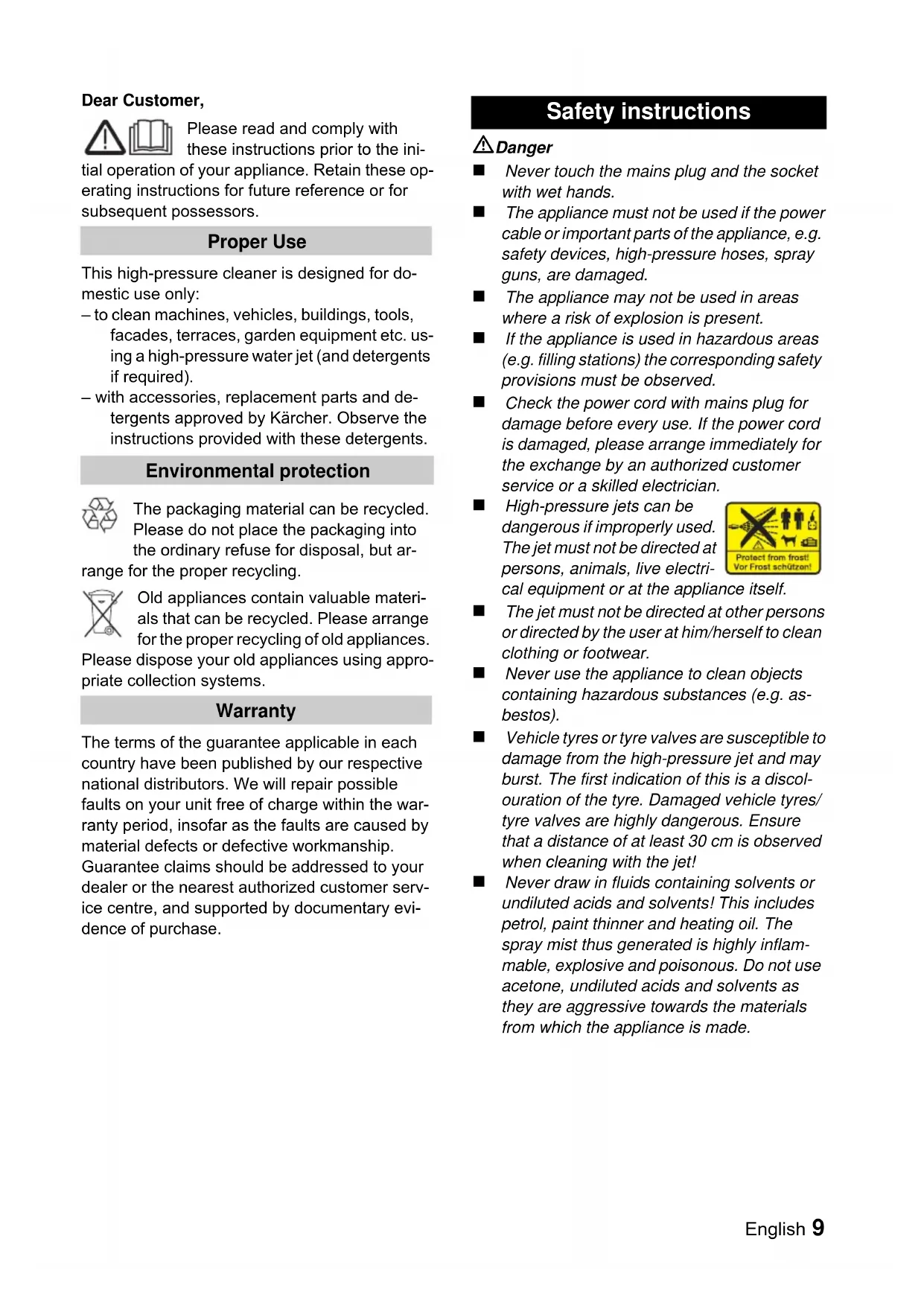 68/EWG) 2000/14/EG Angewandte harmonisierte Normen EN 60335–1 EN 60335–2–79 EN 55014–1: 2000 + A1: 2001 + A2: 2002 EN 55014–2: 1997 + A1: 2001 EN 61000–3–2: 2000 + A2: 2005 EN 61000–3–3: 1995 + A1: 2001 Angewandtes Konformitätsbewertungsver- fahren Anhang V Schallleistungspegel dB(A) Gemessen: 85 dB(A) Garantiert: 87 dB(A)English 9 Dear Customer, Please read and comply with these instructions prior to the ini- tial operation of your appliance. Retain these op- erating instructions for future reference or for subsequent possessors. This high-pressure cleaner is designed for do- mestic use only: – to clean machines, vehicles, buildings, tools, facades, terraces, garden equipment etc. us- ing a high-pressure water jet (and detergents if required). – with accessories, replacement parts and de- tergents approved by Kärcher. Observe the instructions provided with these detergents. The packaging material can be recycled. Please do not place the packaging into the ordinary refuse for disposal, but ar- range for the proper recycling. Old appliances contain valuable materi- als that can be recycled. Please arrange for the proper recycling of old appliances. Please dispose your old appliances using appro- priate collection systems. The terms of the guarantee applicable in each country have been published by our respective national distributors. We will repair possible faults on your unit free of charge within the war- ranty period, insofar as the faults are caused by material defects or defective workmanship. Guarantee claims should be addressed to your dealer or the nearest authorized customer serv- ice centre, and supported by documentary evi- dence of purchase. Danger Never touch the mains plug and the socket with wet hands. The appliance must not be used if the power cable or important parts of the appliance, e.g. safety devices, high-pressure hoses, spray guns, are damaged. The appliance may not be used in areas where a risk of explosion is present. If the appliance is used in hazardous areas (e.g. filling stations) the corresponding safety provisions must be observed. Check the power cord with mains plug for damage before every use. If the power cord is damaged, please arrange immediately for the exchange by an authorized customer service or a skilled electrician. High-pressure jets can be dangerous if improperly used. The jet must not be directed at persons, animals, live electri- cal equipment or at the appliance itself. The jet must not be directed at other persons or directed by the user at him/herself to clean clothing or footwear. Never use the appliance to clean objects containing hazardous substances (e.g. as- bestos). Vehicle tyres or tyre valves are susceptible to damage from the high-pressure jet and may burst. The first indication of this is a discol- ouration of the tyre. Damaged vehicle tyres/ tyre valves are highly dangerous. Ensure that a distance of at least 30 cm is observed when cleaning with the jet! Never draw in fluids containing solvents or undiluted acids and solvents! This includes petrol, paint thinner and heating oil. The spray mist thus generated is highly inflam- mable, explosive and poisonous. Do not use acetone, undiluted acids and solvents as they are aggressive towards the materials from which the appliance is made. Proper Use Environmental protection Warranty Safety instructions10 English 몇 Warning Unsuitable extension cables can be hazard- ous. Only use extension cables outdoors which have been approved for this purpose and labelled with a sufficient cable cross sec- tion: