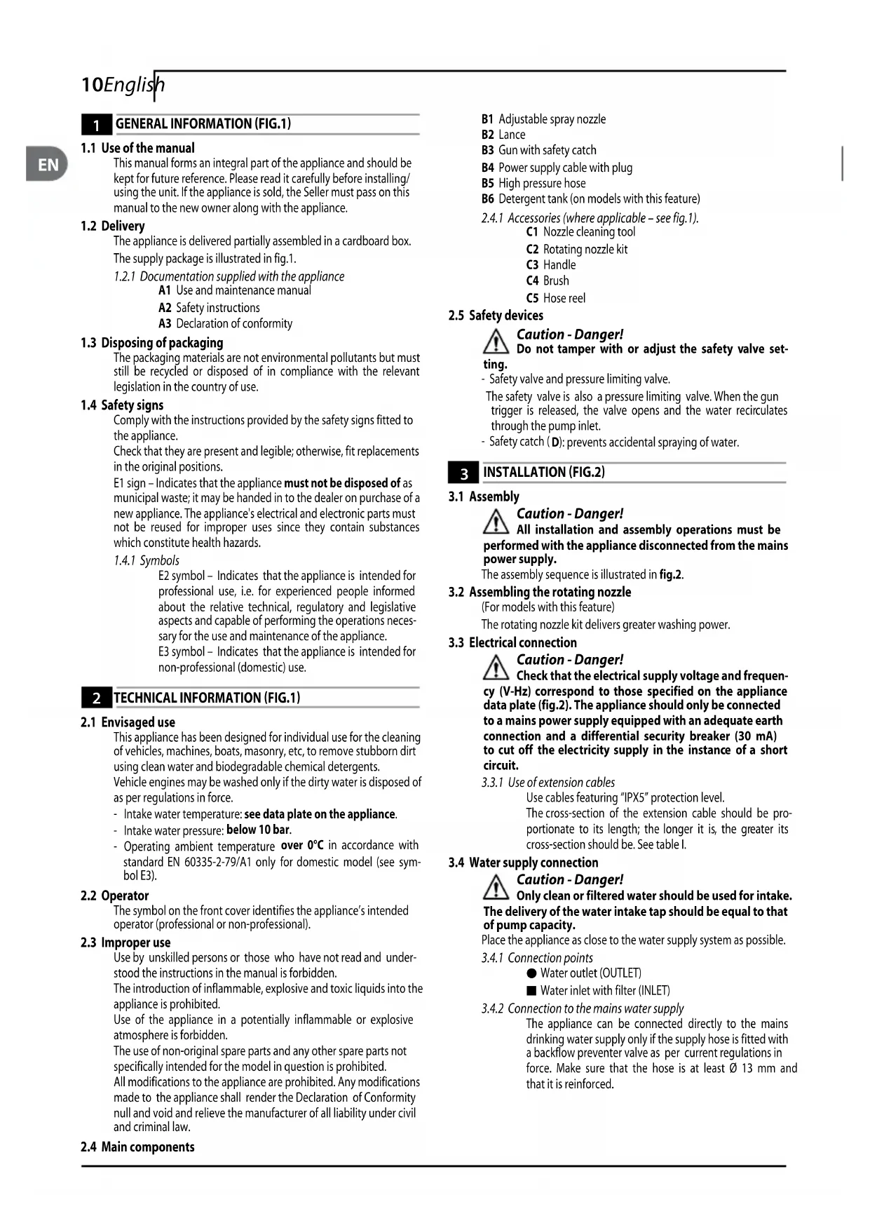 This appliance has been designed for individual use for the cleaning of vehicles, machines, boats, masonry, etc, to remove stubborn dirt using clean water and biodegradable chemical detergents. Vehicle engines may be washed only if the dirty water is disposed of as per regulations in force.- Intake water temperature: see data plate on the appliance.- Intake water pressure: below 10 bar.- Operating ambient temperature over 0°C in accordance with standard EN 60335-2-79/A1 only for domestic model (see sym- bol E3).