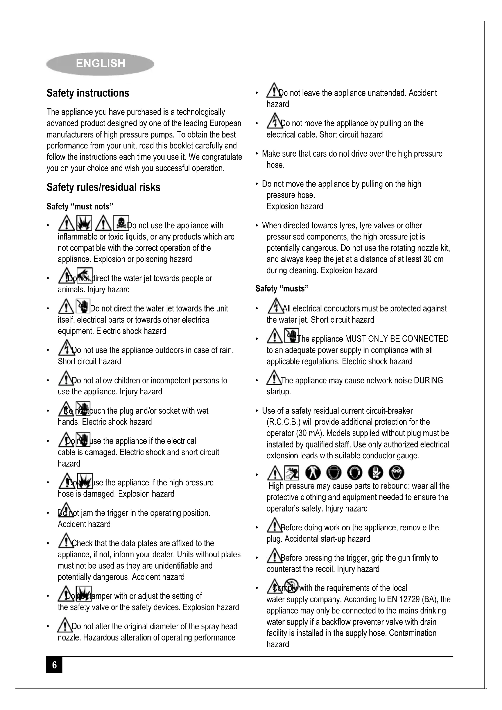 ENGLISH Safety instructions The appliance you have purchased is a technologically advanced product designed by one of the leading European manufacturers of high pressure pumps. To obtain the best performance from your unit, read this booklet carefully and follow the instructions each time you use it. We congratulate you on your choice and wish you successful operation. Safety rules/residual risks Safety “must nots”