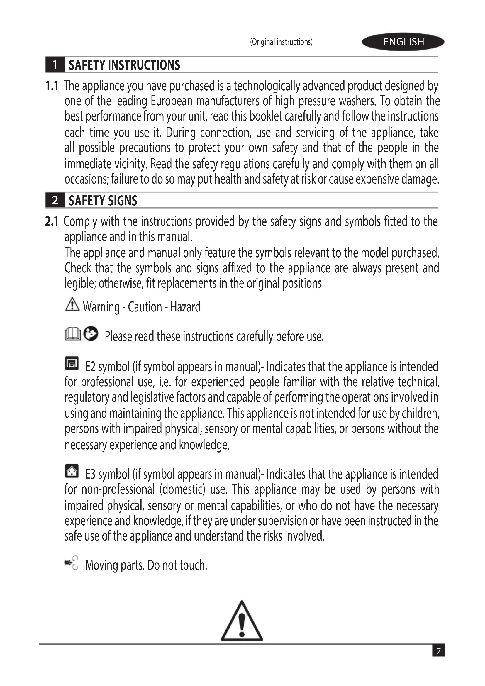appliance and in this manual. The appliance and manual only feature the symbols relevant to the model purchased. Check that the symbols and signs affixed to the appliance are always present and legible; otherwise, fit replacements in the original positions. Warning - Caution - Hazard Please read these instructions carefully before use. E2 symbol (if symbol appears in manual)- Indicates that the appliance is intended for professional use, i.e. for experienced people familiar with the relative technical, regulatory and legislative factors and capable of performing the operations involved in using and maintaining the appliance. This appliance is not intended for use by children, persons with impaired physical, sensory or mental capabilities, or persons without the necessary experience and knowledge. E3 symbol (if symbol appears in manual)- Indicates that the appliance is intended for non-professional (domestic) use. This appliance may be used by persons with impaired physical, sensory or mental capabilities, or who do not have the necessary experience and knowledge, if they are under supervision or have been instructed in the safe use of the appliance and understand the risks involved. Moving parts. Do not touch.8 ENGLISH (Original instructions) 0 Switch “OFF” position I Switch “ON” position Guaranteed sound power level Prohibition sign, informs users that local regulations may prohibit connection of the product to the drinking water supply system. Danger sign, warns users not to direct the water jet at people, animals, electrical equipment or the product itself. This product is rated in insulation class II. This means it has reinforced or double insulation (only if symbol appears on appliance). This product is rated in insulation class I. This means that it is equipped with a protective earthing conductor (only if symbol appears on appliance). The product complies with the relevant European directives. E1 symbol - Indicates that the appliance must not be disposed of as municipal waste; it may be handed in to the dealer on purchase of a new appliance. The appliance’s electrical and electronic parts must not be reused for improper uses since they contain substances which constitute health hazards. Wear ear defenders. Wear a protective mask. Wear respiratory protection. Wear protective gloves. Wear safety footwear. Wear protective clothing.9 ENGLISH (Original instructions)