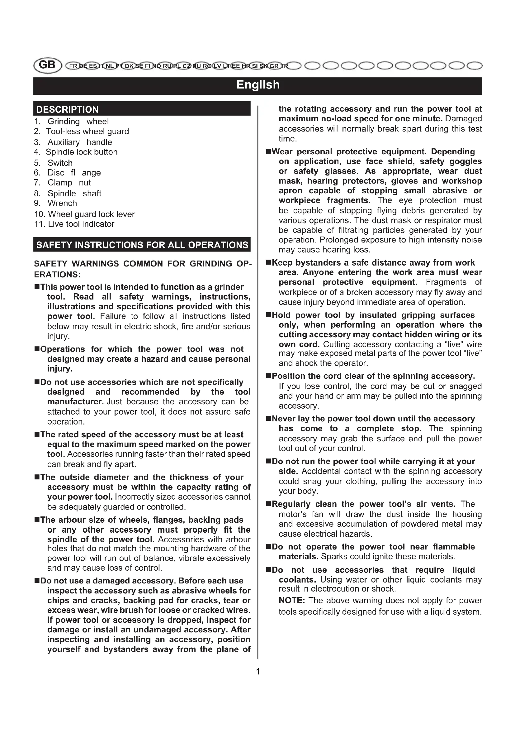 ERATIONS: This power tool is intended to function as a grinder tool. Read all safety warnings, instructions, illustrations and specifications provided with this power tool. Failure to follow all instructions listed below may result in electric shock, fire and/or serious injury. Operations for which the power tool was not designed may create a hazard and cause personal injury. Do not use accessories which are not specifically designed and recommended by the tool manufacturer. Just because the accessory can be attached to your power tool, it does not assure safe operation. The rated speed of the accessory must be at least equal to the maximum speed marked on the power tool. Accessories running faster than their rated speed can break and fly apart. The outside diameter and the thickness of your accessory must be within the capacity rating of your power tool. Incorrectly sized accessories cannot be adequately guarded or controlled. The arbour size of wheels, flanges, backing pads or any other accessory must properly fit the spindle of the power tool. Accessories with arbour holes that do not match the mounting hardware of the power tool will run out of balance, vibrate excessively and may cause loss of control. Do not use a damaged accessory. Before each use inspect the accessory such as abrasive wheels for chips and cracks, backing pad for cracks, tear or excess wear, wire brush for loose or cracked wires. If power tool or accessory is dropped, inspect for damage or install an undamaged accessory. After inspecting and installing an accessory, position yourself and bystanders away from the plane of the rotating accessory and run the power tool at maximum no-load speed for one minute. Damaged accessories will normally break apart during this test time. Wear personal protective equipment. Depending on application, use face shield, safety goggles or safety glasses. As appropriate, wear dust mask, hearing protectors, gloves and workshop apron capable of stopping small abrasive or workpiece fragments. The eye protection must be capable of stopping flying debris generated by various operations. The dust mask or respirator must be capable of filtrating particles generated by your operation. Prolonged exposure to high intensity noise may cause hearing loss. Keep bystanders a safe distance away from work area. Anyone entering the work area must wear personal protective equipment. Fragments of workpiece or of a broken accessory may fly away and cause injury beyond immediate area of operation. Hold power tool by insulated gripping surfaces only, when performing an operation where the cutting accessory may contact hidden wiring or its own cord. Cutting accessory contacting a “live” wire may make exposed metal parts of the power tool “live” and shock the operator. Position the cord clear of the spinning accessory. If you lose control, the cord may be cut or snagged and your hand or arm may be pulled into the spinning accessory. Never lay the power tool down until the accessory has come to a complete stop. The spinning accessory may grab the surface and pull the power tool out of your control. Do not run the power tool while carrying it at your side. Accidental contact with the spinning accessory could snag your clothing, pulling the accessory into your body. Regularly clean the power tool’s air vents. The motor’s fan will draw the dust inside the housing and excessive accumulation of powdered metal may cause electrical hazards. Do not operate the power tool near flammable materials. Sparks could ignite these materials. Do not use accessories that require liquid coolants. Using water or other liquid coolants may result in electrocution or shock. NOTE: The above warning does not apply for power tools specifically designed for use with a liquid system.2 English