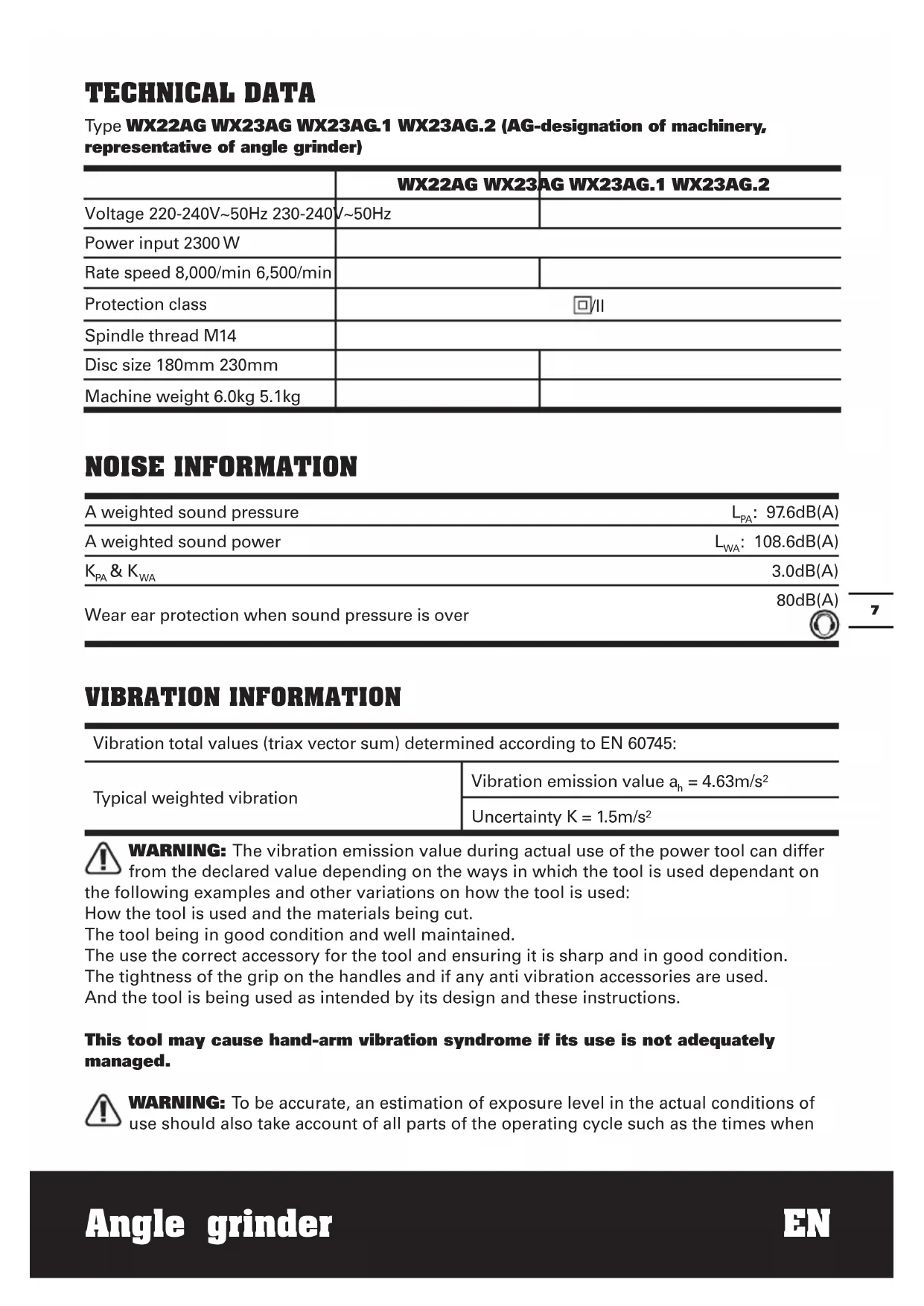 C or less. Plan your work schedule to spread any high vibration tool use across a number of days. ACCESSORIES Spanner 1 Anti-vibration auxiliary handle 1 Metal grinding disc (WX22AG WX23AG WX23AG.1) 1 We recommend that you purchase your accessories from the same store that sold you the tool. Use good quality accessories marked with a well-known brand name. Choose the type according to the work you intend to undertake. Refer to the accessory packaging for further details. Store personnel can assist you and offer advice.Angle grinder EN