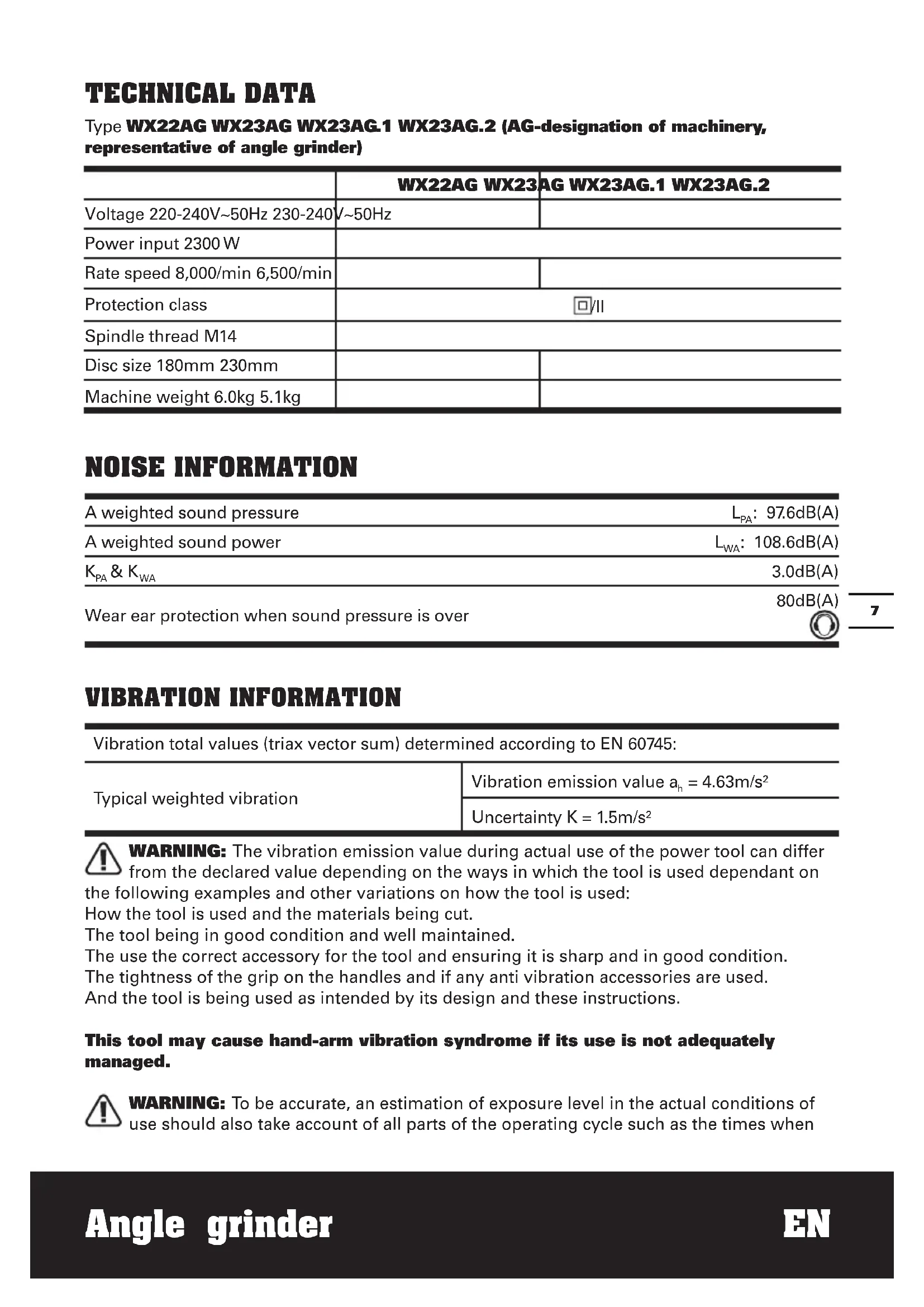C or less. Plan your work schedule to spread any high vibration tool use across a number of days. ACCESSORIES Spanner 1 Anti-vibration auxiliary handle 1 Metal grinding disc (WX22AG WX23AG WX23AG.1) 1 We recommend that you purchase your accessories from the same store that sold you the tool. Use good quality accessories marked with a well-known brand name. Choose the type according to the work you intend to undertake. Refer to the accessory packaging for further details. Store personnel can assist you and offer advice.Angle grinder EN