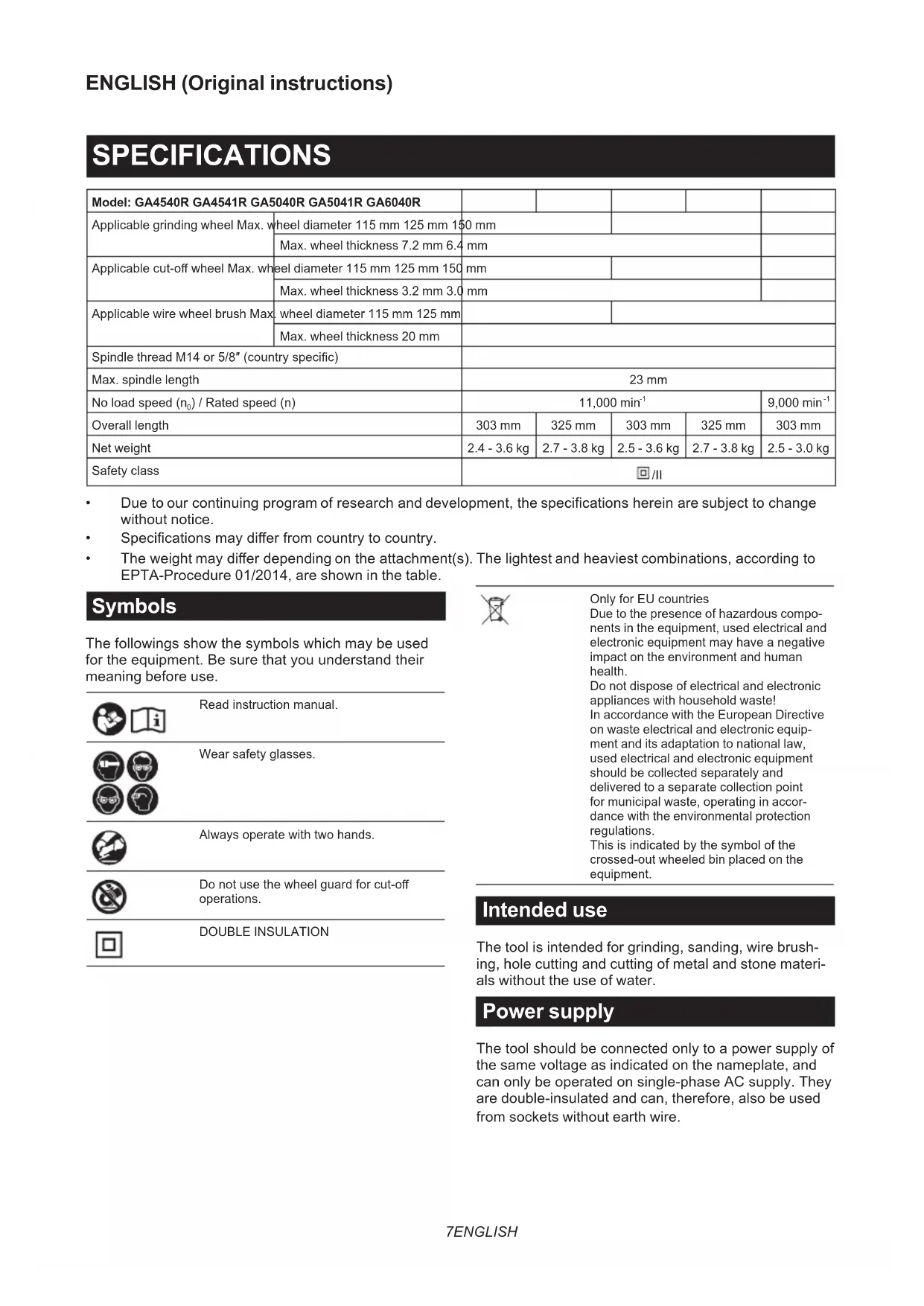- The weight may dier depending on the attachment(s). The lightest and heaviest combinations, according to EPTA-Procedure 01/2014, are shown in the table. Symbols The followings show the symbols which may be used for the equipment. Be sure that you understand their meaning before use. Read instruction manual. Wear safety glasses. Always operate with two hands. Do not use the wheel guard for cut-o operations. DOUBLE INSULATION Only for EU countries Due to the presence of hazardous compo- nents in the equipment, used electrical and electronic equipment may have a negative impact on the environment and human health. Do not dispose of electrical and electronic appliances with household waste! In accordance with the European Directive on waste electrical and electronic equip- ment and its adaptation to national law, used electrical and electronic equipment should be collected separately and delivered to a separate collection point for municipal waste, operating in accor- dance with the environmental protection regulations. This is indicated by the symbol of the crossed-out wheeled bin placed on the equipment. Intended use The tool is intended for grinding, sanding, wire brush- ing, hole cutting and cutting of metal and stone materi- als without the use of water. Power supply The tool should be connected only to a power supply of the same voltage as indicated on the nameplate, and can only be operated on single-phase AC supply. They are double-insulated and can, therefore, also be used from sockets without earth wire.8 ENGLISH Noise The typical A-weighted noise level determined according to EN62841-2-3: Model Sound pressure level (L