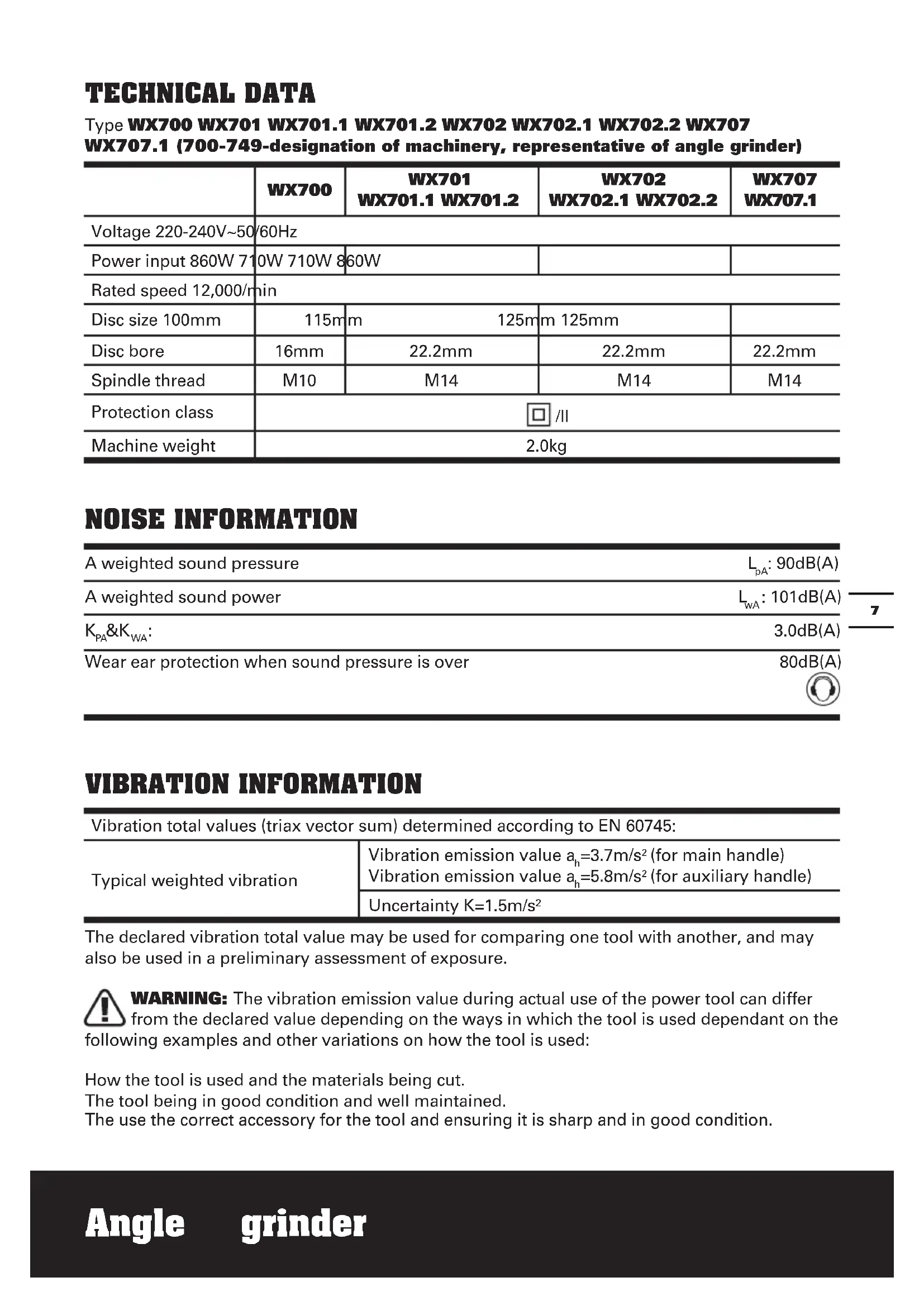 C or less. Plan your work schedule to spread any high vibration tool use across a number of days. ACCESSORIES Spanner 1 Metal grinding disc 1 Auxiliary handle 1 Anti-vibration auxiliary handle (WX707 WX707.1) (See Fig. A) 1 INSTALOCK