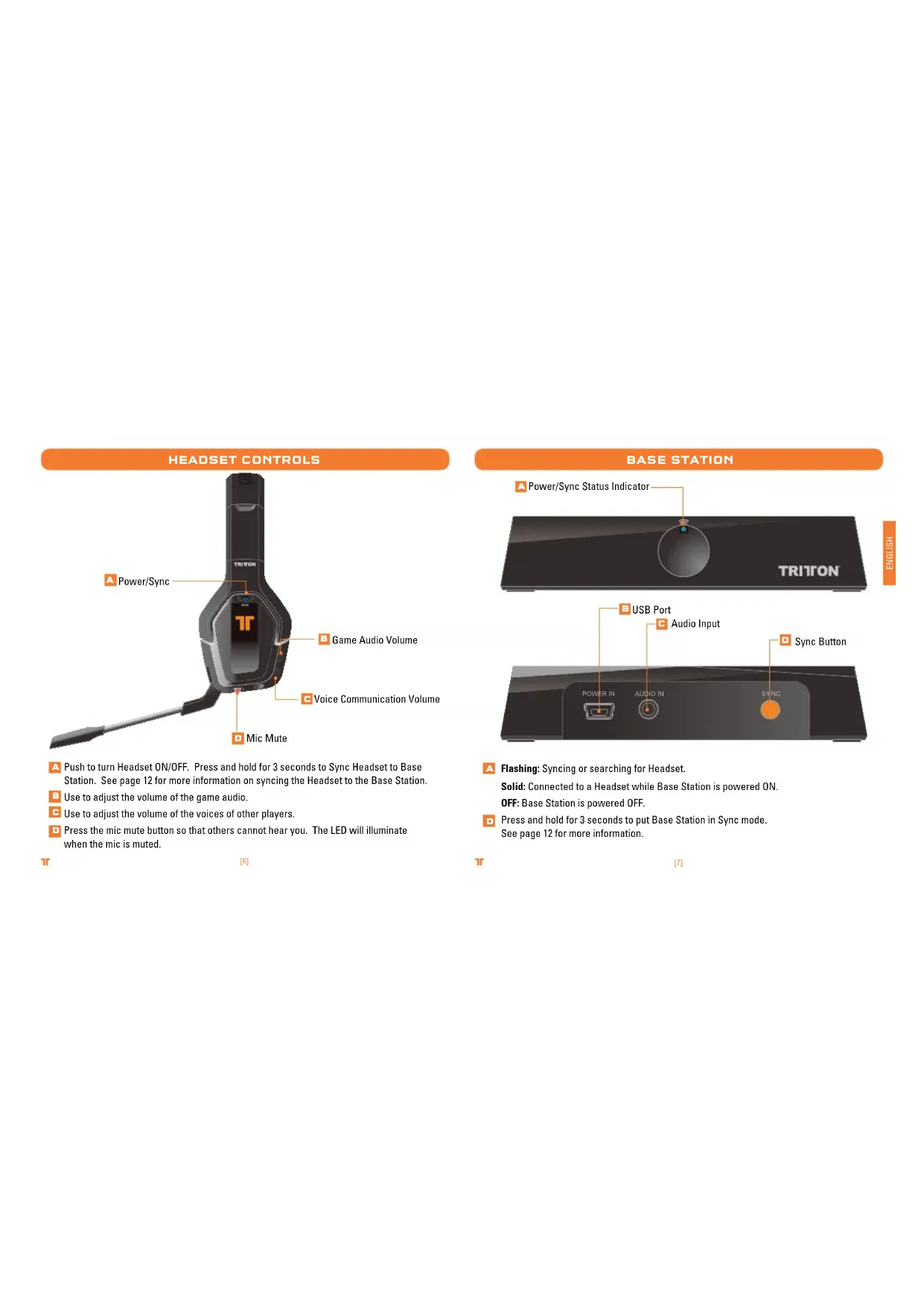 HeaDset Controls Power/Sync Push to turn Headset ON/OFF. Press and hold for 3 seconds to Sync Headset to Base Station. See page 12 for more information on syncing the Headset to the Base Station. Use to adjust the volume of the game audio. Use to adjust the volume of the voices of other players. Press the mic mute button so that others cannot hear you. The LED will illuminate when the mic is muted. Game Audio Volume Voice Communication Volume Mic Mute base statIon AUDIO IN SYNC POWER IN Power/Sync Status Indicator Flashing: Syncing or searching for Headset. Solid: Connected to a Headset while Base Station is powered ON. OFF: Base Station is powered OFF. USB Port Audio Input Sync Button Press and hold for 3 seconds to put Base Station in Sync mode. See page 12 for more information.