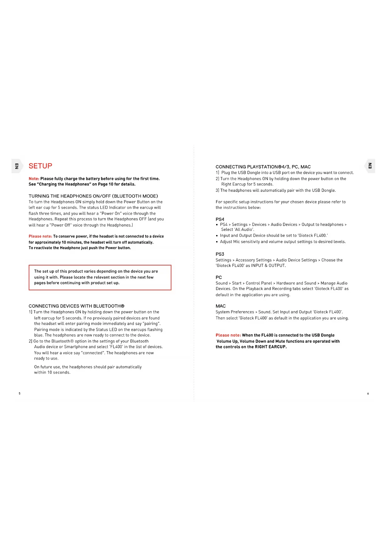 WELCOME Thank you for buying the Gioteck FL400 Wireless Gaming Headset & Bluetooth® Speakers. These Headphones are designed to be convenient, stylish and provide high quality audio Playback from any Bluetooth enabled Audio Device or wired only device. The FL400 Wireless Gaming Headset includes support via USB Dongle for PlayStation®4, PlayStation®3 and USB Audio for PCs and Macs that do not support Bluetooth. The FL400 can be used in Bluetooth mode to receive telephone calls while in use and will automatically pause the audio playback in order to receive the call and when the call ends audio Playback will resume. The FL400 can also be used as portable Bluetooth stereo speakers for enjoying music with friends or listening to movies together. Please read this User Guide thoroughly before use so that you can understand the setup and functions. Before using the headset, turn the volume down to a mid-level or very low, then slowly adjust it to a comfortable level. Exposure to high volume sound levels may cause temporary or permanent damage to your hearing. You should always set your volume to moderate levels and avoid long exposure to high volume levels.