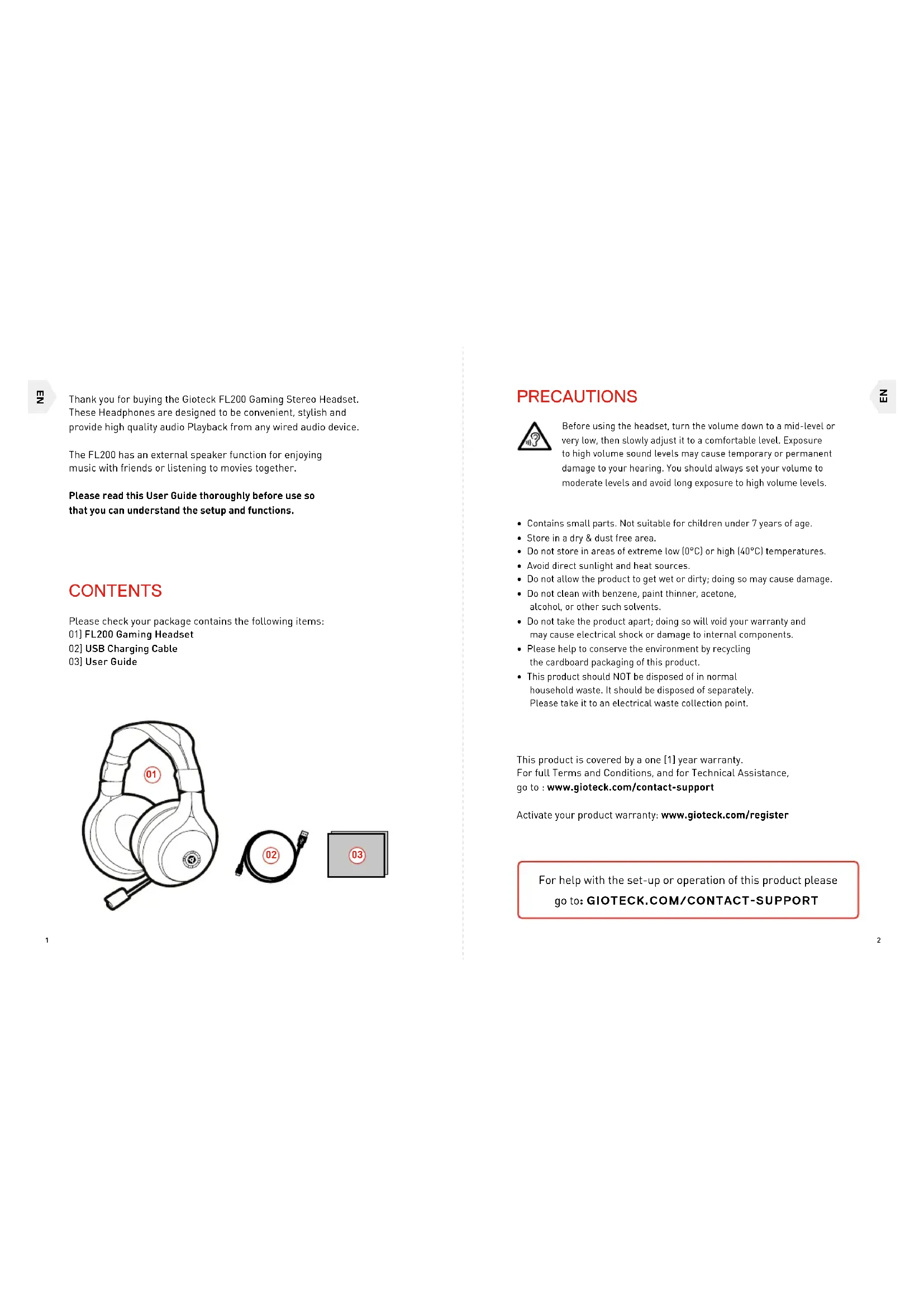 Thank you for buying the Gioteck FL200 Gaming Stereo Headset. These Headphones are designed to be convenient, stylish and provide high quality audio Playback from any wired audio device. The FL200 has an external speaker function for enjoying music with friends or listening to movies together. Please read this User Guide thoroughly before use so that you can understand the setup and functions. CONTENTS Please check your package contains the following items: 01] FL200 Gaming Headset 02] USB Charging Cable 03] User Guide Before using the headset, turn the volume down to a mid-level or very low, then slowly adjust it to a comfortable level. Exposure to high volume sound levels may cause temporary or permanent damage to your hearing. You should always set your volume to moderate levels and avoid long exposure to high volume levels.