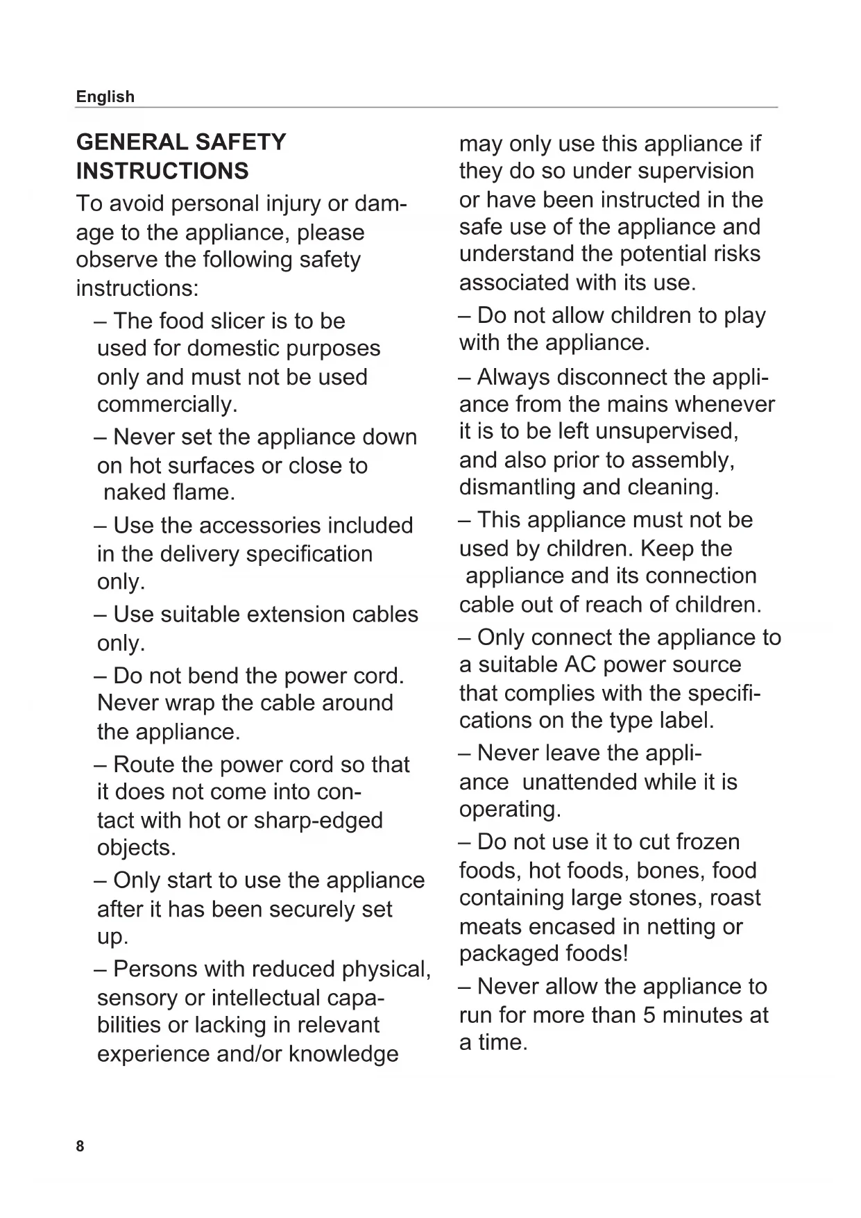 - Plug the cable into the socket. SLICING Use the slice thickness adjust- ment knob (2) to set the required thickness. Note: The slice thickness adjustment scale is not a millimetre scale. For safety reasons, the "0" position is designed to cover the blade. Place the food to be sliced onto the slice carriage (9). Use the left-over holder (10) to press it up against the stop plate (11). Protect your hands, by always using the slice carriage and, where applicable, the left-over holder. Exception: Excessively large foods to be sliced. Turn the appliance on using the power switch (1). Two operat- ing modes are available: Temporary operation: Press the power switch and slide it towards the arrow until you feel some resistance. The rotary blade (6) runs as long as the power switch is pressed and held down in this position. Continuous operation: Press the power switch and slide it towards the arrow beyond the resistance point until it latches into place. The rotary blade runs without the power switch having to be pressed and held down, until you push the power switch back into the "0" position. Note: Never use the appliance for more than a maximum of 5 minutes in continuous operation.