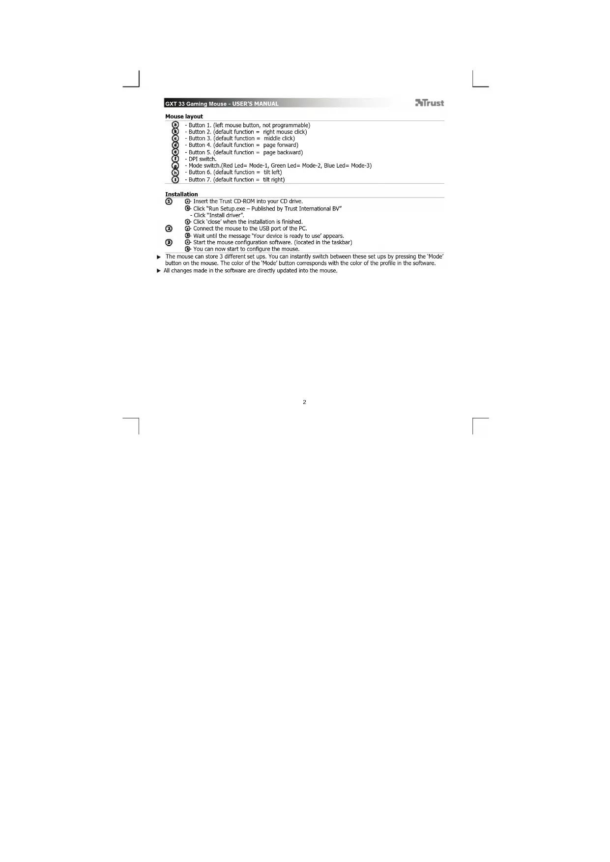 - Insert the Trust CD-ROM into your CD drive. - Click “Run Setup.exe – Published by Trust International BV” - Click “Install driver”. - Click ‘close’ when the installation is finished. - Connect the mouse to the USB port of the PC. - Wait until the message ‘Your device is ready to use’ appears. - Start the mouse configuration software. (located in the taskbar) - You can now start to configure the mouse. The mouse can store 3 different set ups. You can instantly switch between these set ups by pressing the ‘Mode’ button on the mouse. The color of the ‘Mode’ button corresponds with the color of the profile in the software. All changes made in the software are directly updated into the mouse.GXT 33 Gaming Mouse - USER’S MANUAL