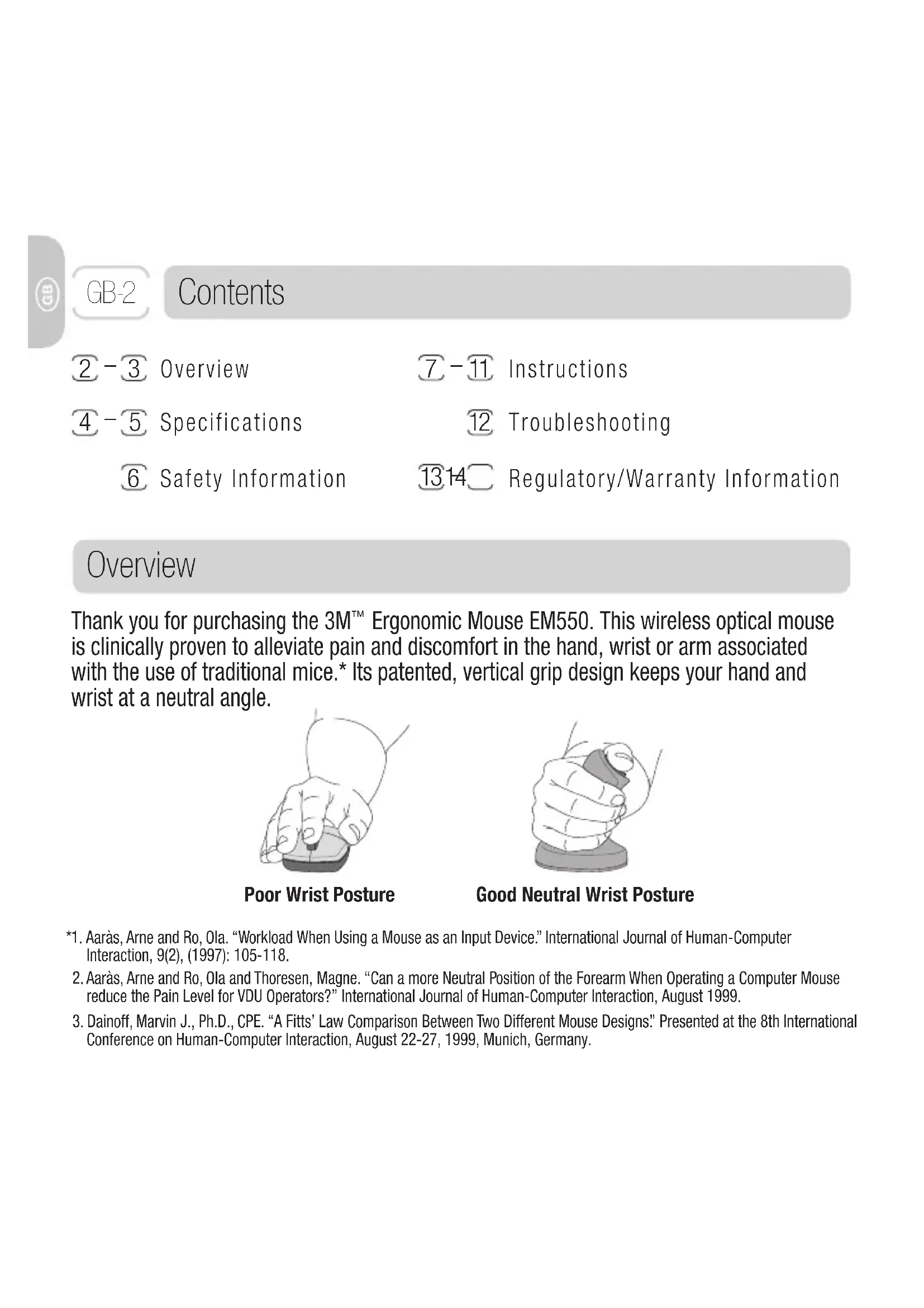 - 1. Aaràs, Arne and Ro, Ola. “Workload When Using a Mouse as an Input Device.” International Journal of Human-Computer Interaction, 9(2), (1997): 105-118. 2. Aaràs, Arne and Ro, Ola and Thoresen, Magne. “Can a more Neutral Position of the Forearm When Operating a Computer Mouse reduce the Pain Level for VDU Operators?” International Journal of Human-Computer Interaction, August 1999. 3. Dainoff, Marvin J., Ph.D., CPE. “A Fitts’ Law Comparison Between Two Different Mouse Designs.” Presented at the 8th International Conference on Human-Computer Interaction, August 22-27, 1999, Munich, Germany. GB-2