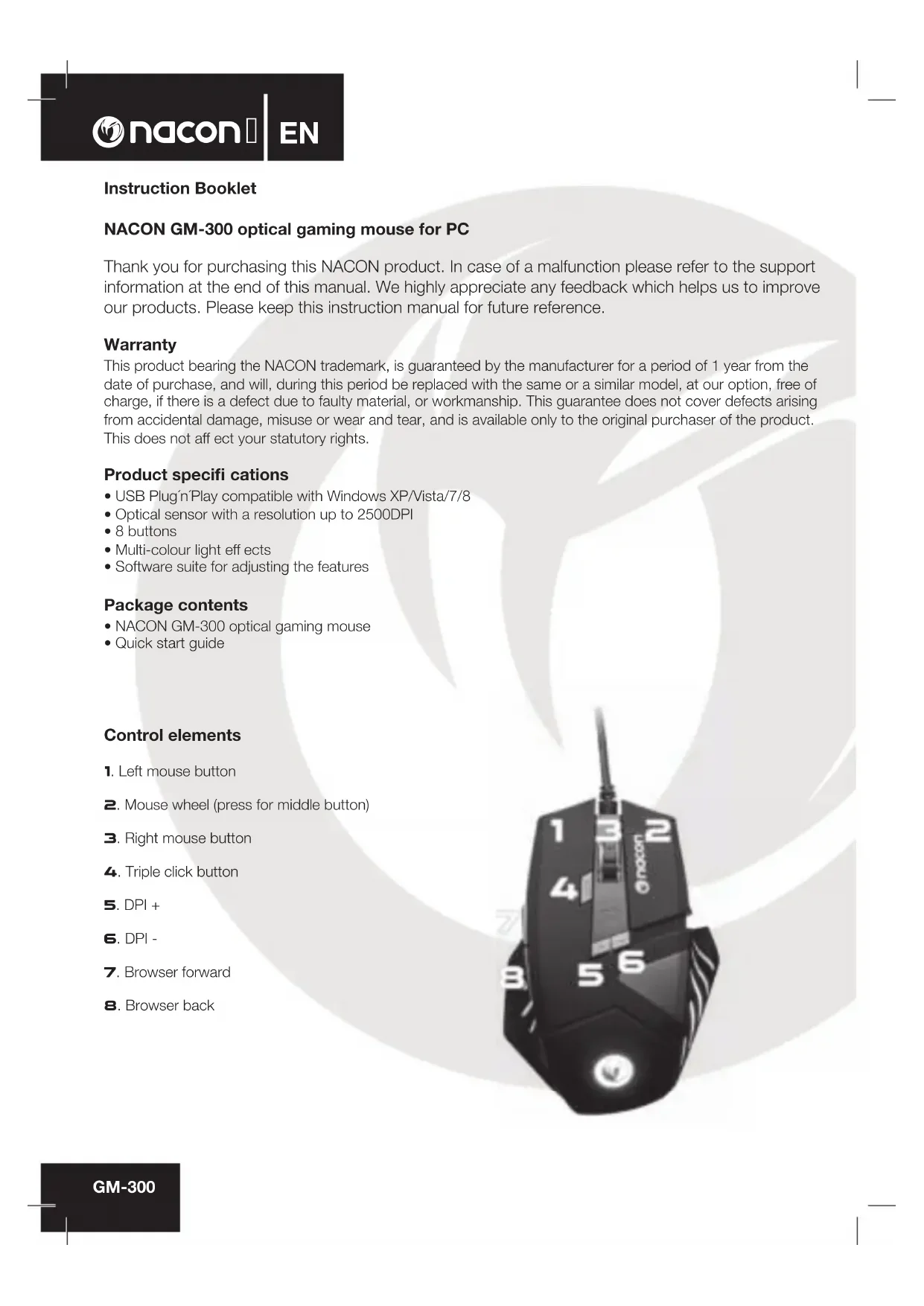 Instruction Booklet NACON GM-300 optical gaming mouse for PC Thank you for purchasing this NACON product. In case of a malfunction please refer to the support information at the end of this manual. We highly appreciate any feedback which helps us to improve our products. Please keep this instruction manual for future reference. Warranty This product bearing the NACON trademark, is guaranteed by the manufacturer for a period of 1 year from the date of purchase, and will, during this period be replaced with the same or a similar model, at our option, free of charge, if there is a defect due to faulty material, or workmanship. This guarantee does not cover defects arising from accidental damage, misuse or wear and tear, and is available only to the original purchaser of the product. This does not aff ect your statutory rights. Product specifi cations