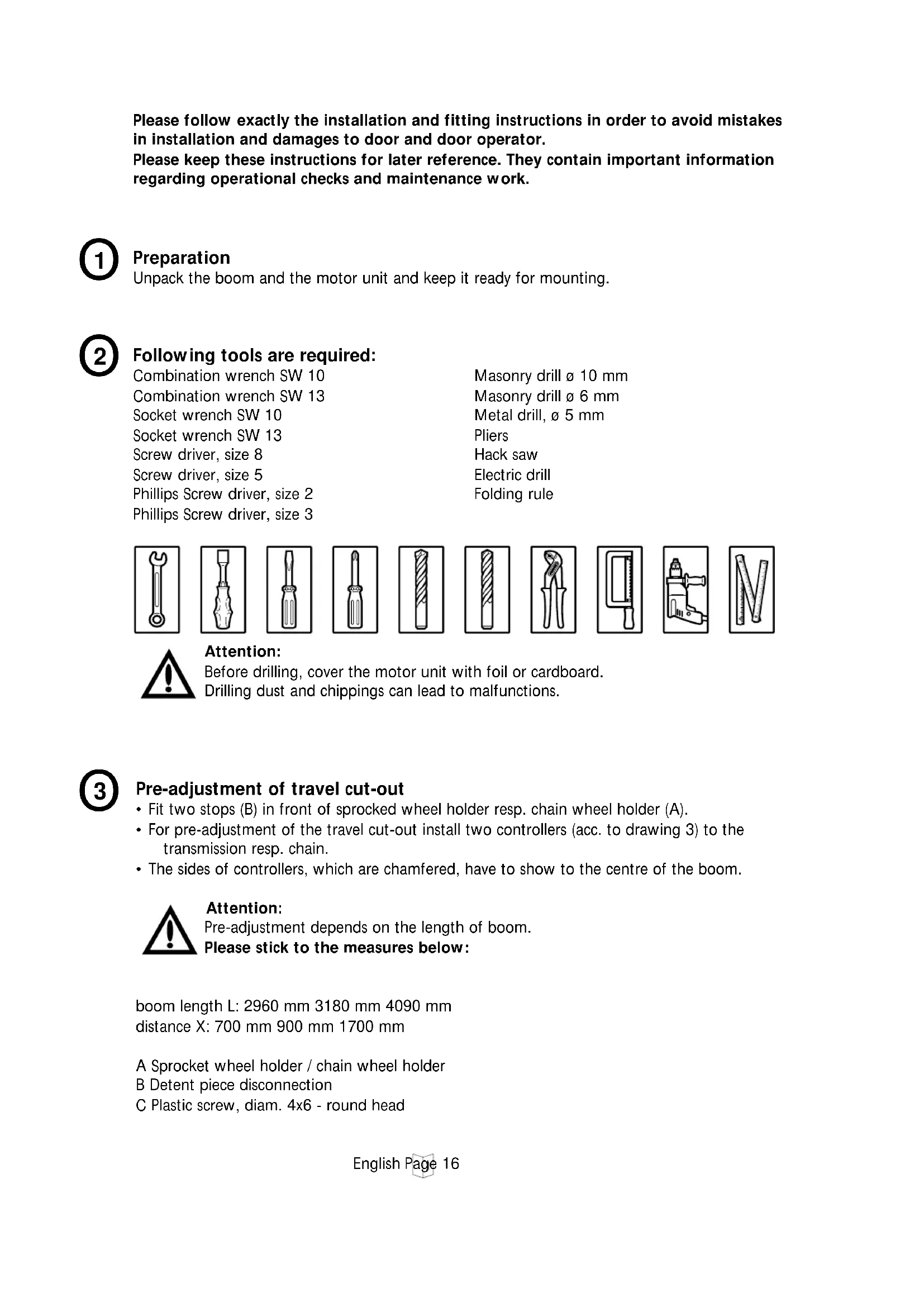 22English Page 16 Please follow exactly the installation and fitting instructions in order to avoid mistakes in installation and damages to door and door operator. Please keep these instructions for later reference. They contain important information regarding operational checks and maintenance work. Following tools are required: Combination wrench SW 10 Combination wrench SW 13 Socket wrench SW 10 Socket wrench SW 13 Screw driver, size 8 Screw driver, size 5 Phillips Screw driver, size 2 Phillips Screw driver, size 3 Masonry drill ø 10 mm Masonry drill ø 6 mm Metal drill, ø 5 mm Pliers Hack saw Electric drill Folding rule