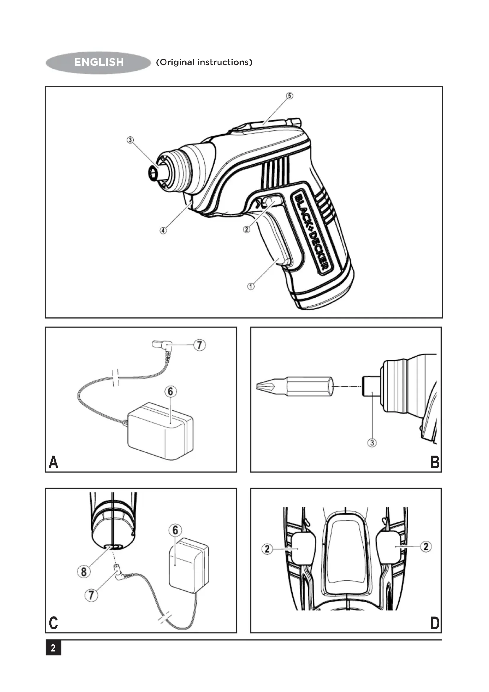 ENGLISH (Original instructions)8 ENGLISH (Original instructions) Assembly Fitting and removing a drill bit or a screwdriver bit (fig. B) This tool uses screwdriver bits and drill bits with a 6.35 mm (1/4") hexagonal shank.