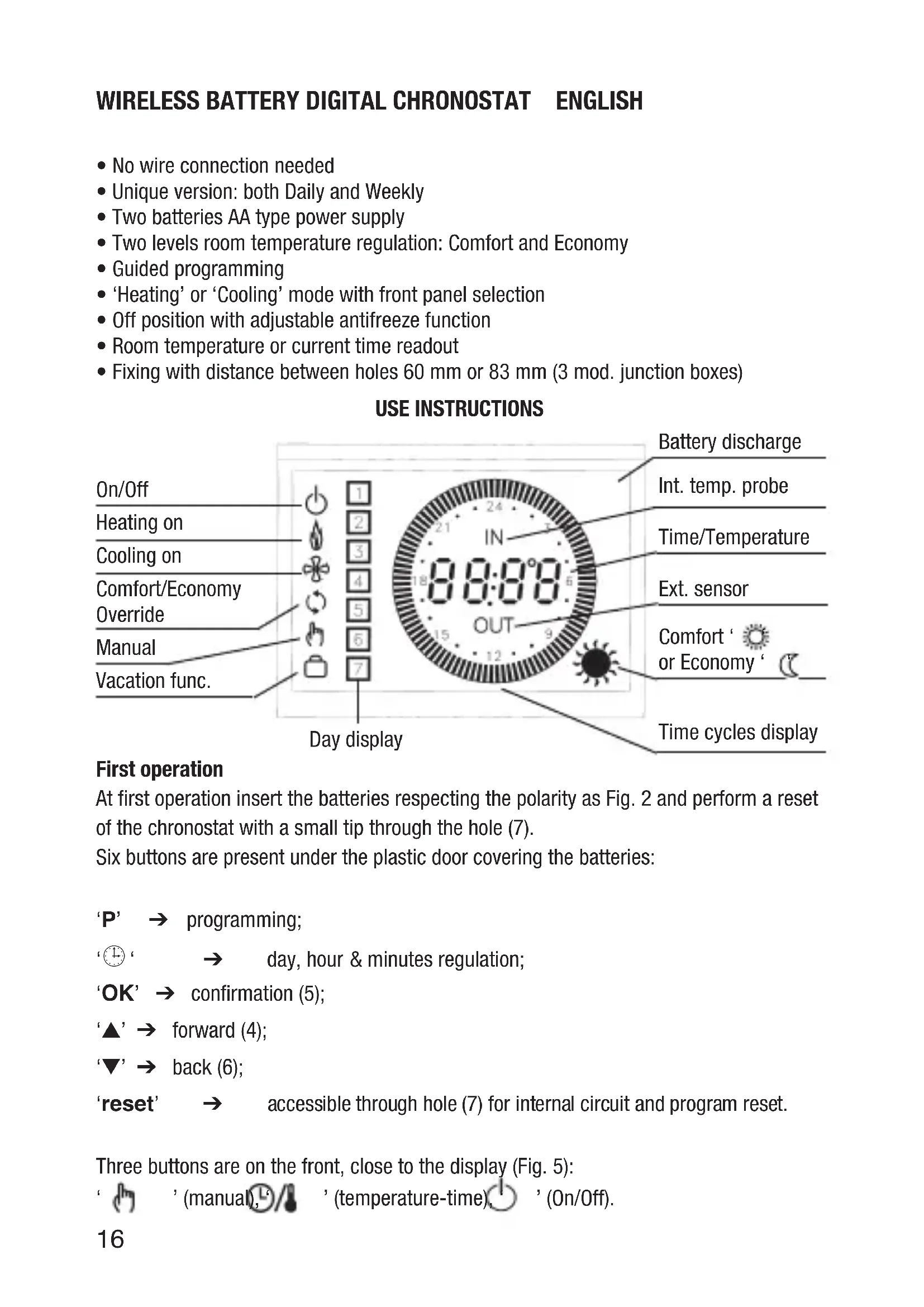At first operation insert the batteries respecting the polarity as Fig. 2 and perform a reset of the chronostat with a small tip through the hole (7).