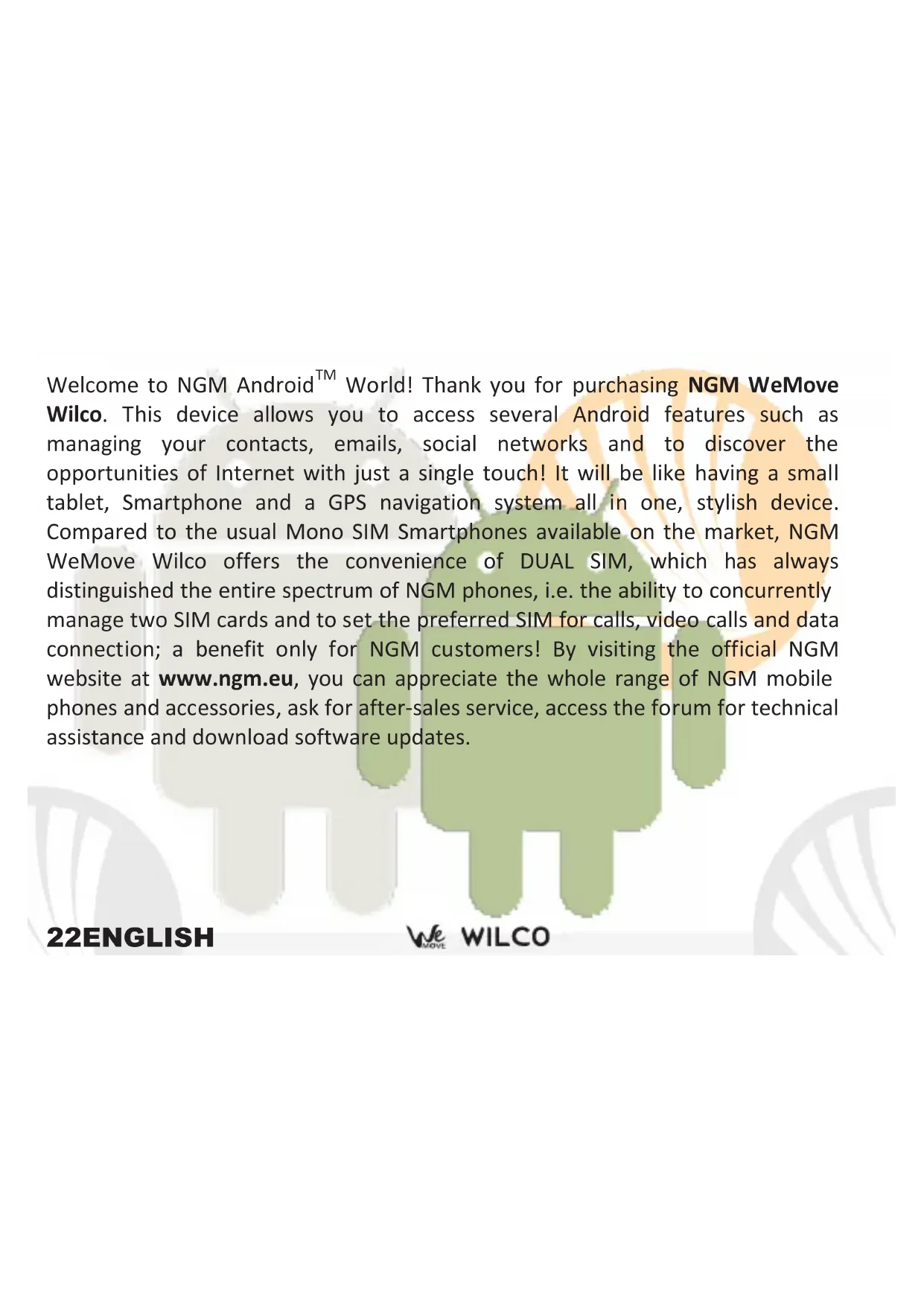 World! Thank you for purchasing NGM WeMove Wilco. This device allows you to access several Android features such as managing your contacts, emails, social networks and to discover the opportunities of Internet with just a single touch! It will be like having a small tablet, Smartphone and a GPS navigation system all in one, stylish device. Compared to the usual Mono SIM Smartphones available on the market, NGM WeMove Wilco offers the convenience of DUAL SIM, which has always distinguished the entire spectrum of NGM phones, i.e. the ability to concurrently manage two SIM cards and to set the preferred SIM for calls, video calls and data connection; a benefit only for NGM customers! By visiting the official NGM website at www.ngm.eu, you can appreciate the whole range of NGM mobile phones and accessories, ask for after-sales service, access the forum for technical assistance and download software updates.23ENGLISH Set up Installing the USIM cards: The USIM card stores information as your personal phone number, PIN code, carrier services numbers, contacts and other important details. To access the USIM slots, turn off the phone, take off the back cover by lifting it up from the bottom, and remove the battery. Insert your USIM cards simply by sliding them into their slots; follow the illustration. Slot 1 supports WCDMA. Installing the memory card: In order to use all functions of NGM WeMove Wilco, it is advisable to install a micro-SD card: the card has to be inserted in the back side of the phone, after removing the back cover and the battery; SD card slot is placed right to the USIM slots, upward the battery area. Slide in the memory card so that the gold contacts are turned downwards.