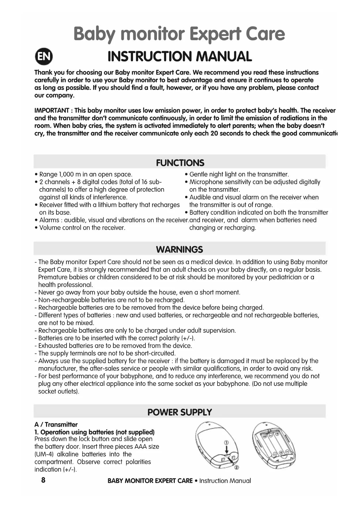 INSTRUCTION MANUAL WARNINGS - The Baby monitor Expert Care should not be seen as a medical device. In addition to using Baby monitorExpert Care, it is strongly recommended that an adult checks on your baby directly, on a regular basis.Premature babies or children considered to be at risk should be monitored by your pediatrician or ahealth professional. - Never go away from your baby outside the house, even a short moment.- Non-rechargeable batteries are not to be recharged.- Rechargeable batteries are to be removed from the device before being charged.- Different types of batteries : new and used batteries, or rechargeable and not rechargeable batteries,are not to be mixed.- Rechargeable batteries are only to be charged under adult supervision.- Batteries are to be inserted with the correct polarity (+/-). - Exhausted batteries are to be removed from the device. - The supply terminals are not to be short-circuited. - Always use the supplied battery for the receiver : if the battery is damaged it must be replaced by themanufacturer, the after-sales service or people with similar qualifications, in order to avoid any risk.- For best performance of your babyphone, and to reduce any interference, we recommend you do notplug any other electrical appliance into the same socket as your babyphone. (Do not use multiplesocket outlets). POWER SUPPLY A / Transmitter1. Operation using batteries (not supplied)Press down the lock button and slide openthe battery door. Insert three pieces AAA size(UM-4) alkaline batteries into thecompartment. Observe correct polaritiesindication (+/-). Baby monitor Expert Care