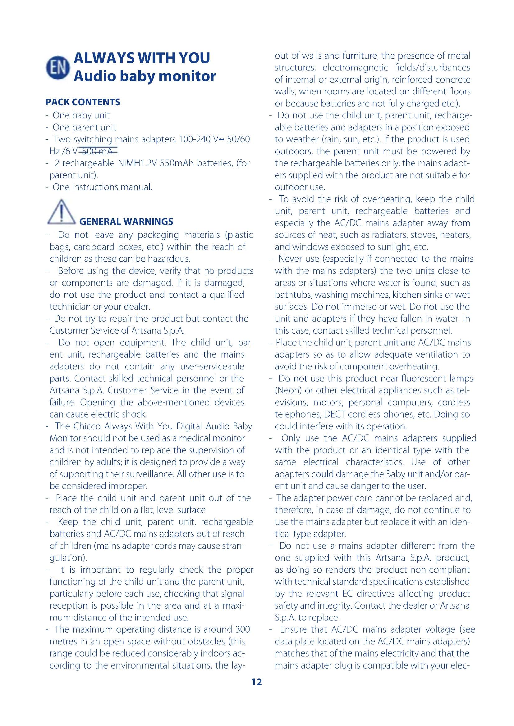 Audio baby monitor PACK CONTENTS - One baby unit - One parent unit - Two switching mains adapters 100-240 V~ 50/60 Hz /6 V 500 mA - 2 rechargeable NiMH1.2V 550mAh batteries, (for parent unit). - One instructions manual. GENERAL WARNINGS - Do not leave any packaging materials (plastic bags, cardboard boxes, etc.) within the reach of children as these can be hazardous. - Before using the device, verify that no products or components are damaged. If it is damaged, do not use the product and contact a qualied technician or your dealer. - Do not try to repair the product but contact the Customer Service of Artsana S.p.A. - Do not open equipment. The child unit, par- ent unit, rechargeable batteries and the mains adapters do not contain any user-serviceable parts. Contact skilled technical personnel or the Artsana S.p.A. Customer Service in the event of failure. Opening the above-mentioned devices can cause electric shock. - The Chicco Always With You Digital Audio Baby Monitor should not be used as a medical monitor and is not intended to replace the supervision of children by adults; it is designed to provide a way of supporting their surveillance. All other use is to be considered improper. - Place the child unit and parent unit out of the reach of the child on a at, level surface - Keep the child unit, parent unit, rechargeable batteries and AC/DC mains adapters out of reach of children (mains adapter cords may cause stran- gulation). - It is important to regularly check the proper functioning of the child unit and the parent unit, particularly before each use, checking that signal reception is possible in the area and at a maxi- mum distance of the intended use. - The maximum operating distance is around 300 metres in an open space without obstacles (this range could be reduced considerably indoors ac- cording to the environmental situations, the lay- out of walls and furniture, the presence of metal structures, electromagnetic elds/disturbances of internal or external origin, reinforced concrete walls, when rooms are located on dierent oors or because batteries are not fully charged etc.). - Do not use the child unit, parent unit, recharge- able batteries and adapters in a position exposed to weather (rain, sun, etc.). If the product is used outdoors, the parent unit must be powered by the rechargeable batteries only: the mains adapt- ers supplied with the product are not suitable for outdoor use. - To avoid the risk of overheating, keep the child unit, parent unit, rechargeable batteries and especially the AC/DC mains adapter away from sources of heat, such as radiators, stoves, heaters, and windows exposed to sunlight, etc. - Never use (especially if connected to the mains with the mains adapters) the two units close to areas or situations where water is found, such as bathtubs, washing machines, kitchen sinks or wet surfaces. Do not immerse or wet. Do not use the unit and adapters if they have fallen in water. In this case, contact skilled technical personnel. - Place the child unit, parent unit and AC/DC mains adapters so as to allow adequate ventilation to avoid the risk of component overheating. - Do not use this product near uorescent lamps (Neon) or other electrical appliances such as tel- evisions, motors, personal computers, cordless telephones, DECT cordless phones, etc. Doing so could interfere with its operation. - Only use the AC/DC mains adapters supplied with the product or an identical type with the same electrical characteristics. Use of other adapters could damage the Baby unit and/or par- ent unit and cause danger to the user. - The adapter power cord cannot be replaced and, therefore, in case of damage, do not continue to use the mains adapter but replace it with an iden- tical type adapter. - Do not use a mains adapter dierent from the one supplied with this Artsana S.p.A. product, as doing so renders the product non-compliant with technical standard specications established by the relevant EC directives aecting product safety and integrity. Contact the dealer or Artsana S.p.A. to replace. - Ensure that AC/DC mains adapter voltage (see data plate located on the AC/DC mains adapters) matches that of the mains electricity and that the mains adapter plug is compatible with your elec-13 trical system sockets. - Connect the AC/DC mains adapters to easily ac- cessible power sockets which are, however, out of reach of children. Position AC/DC mains adapter cords so as to prevent the cord from being walked on, from getting caught in items placed upon or against them, or from being accessible to the child and therefore constituting a risk (trip- ping, choking). - The AC/DC mains adapters, child unit and the par- ent unit may be become hot to the touch when in use. This is normal. - Always disconnect the AC/DC mains adapters from the power socket when the product is not in use. - The rechargeable batteries must always be re- placed by adults only and with other recharge- able batteries having the same characteristics as those indicated in these instructions. WARNING!