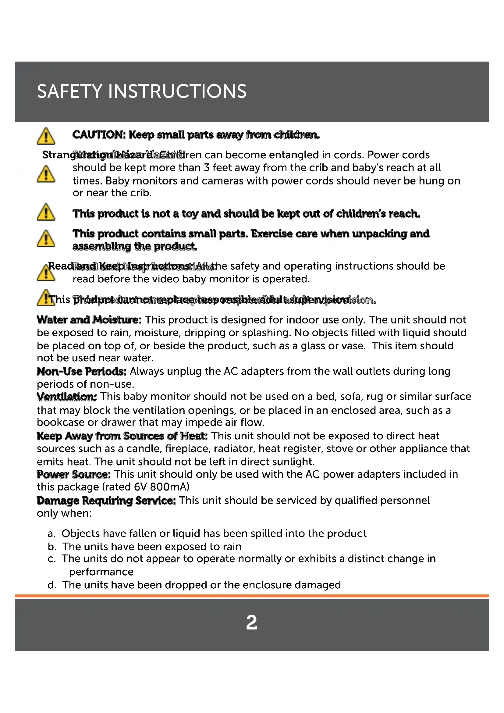 - The power adapters may not be properly connected No reception • Camera and monitor may not be properly paired; follow PAIRING instructions