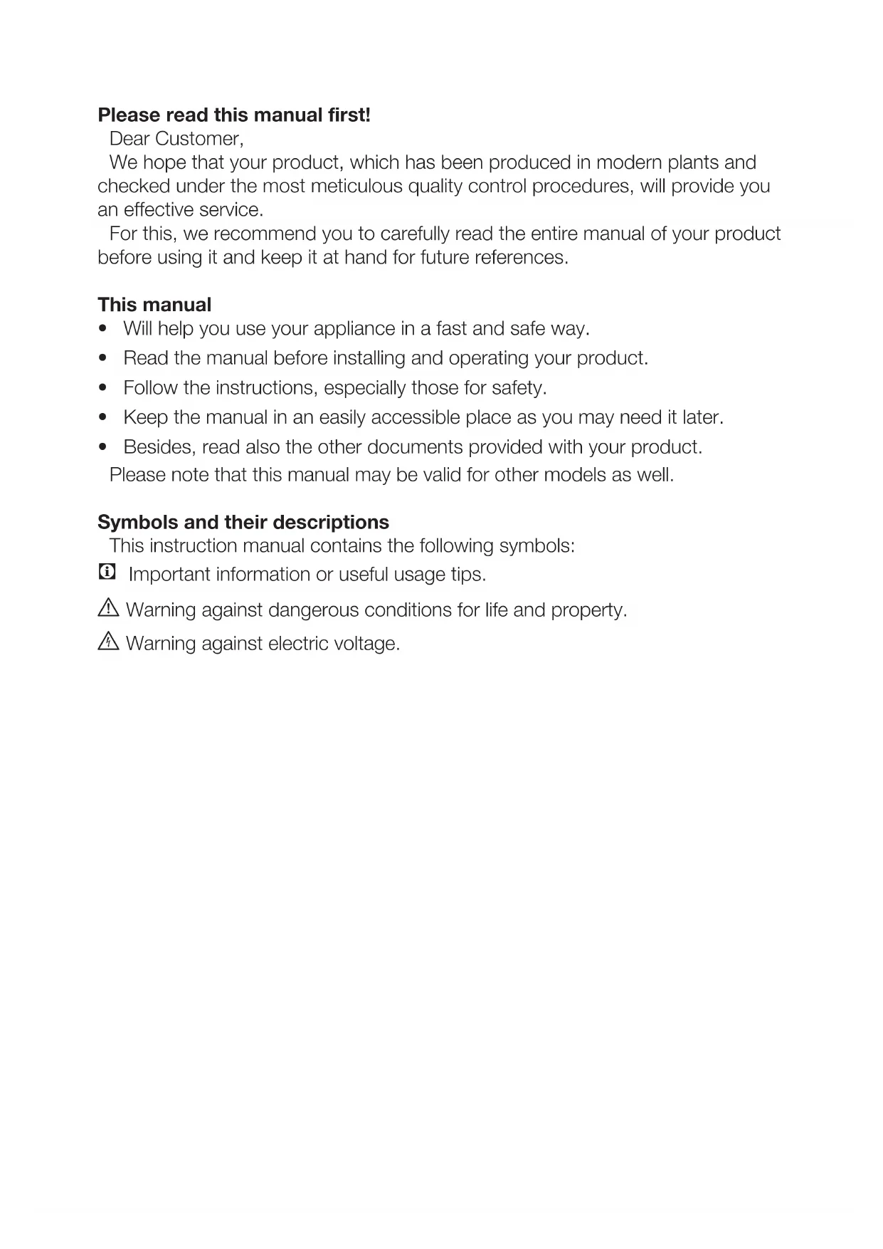 - Besides, read also the other documents provided with your product. Please note that this manual may be valid for other models as well. Symbols and their descriptions This instruction manual contains the following symbols: C Important information or useful usage tips. A Warning against dangerous conditions for life and property. B Warning against electric voltage.EN