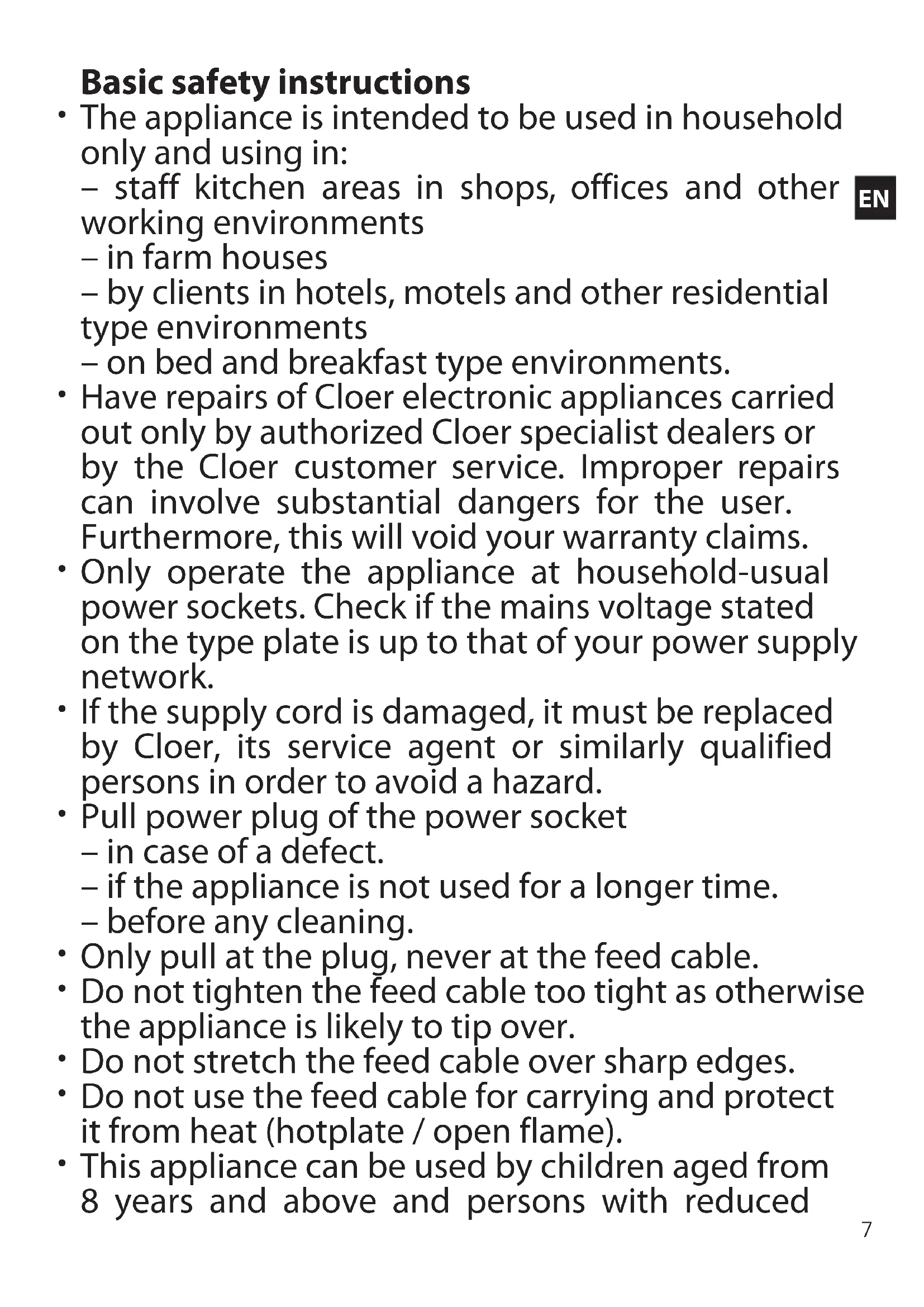 - Have repairs of Cloer electronic appliances carried out only by authorized Cloer specialist dealers or by the Cloer customer service. Improper repairs can involve substantial dangers for the user. Furthermore, this will void your warranty claims.