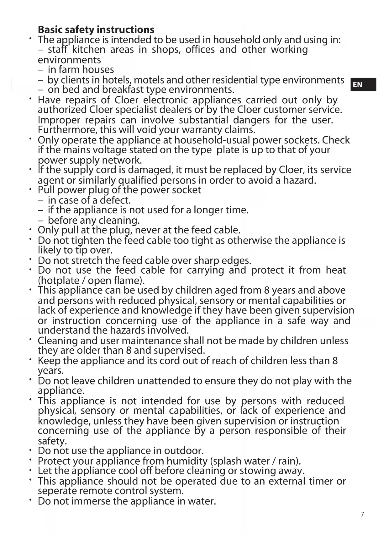 Have repairs of Cloer electronic appliances carried out only by authorized Cloer specialist dealers or by the Cloer customer service. Improper repairs can involve substantial dangers for the user. Furthermore, this will void your warranty claims.