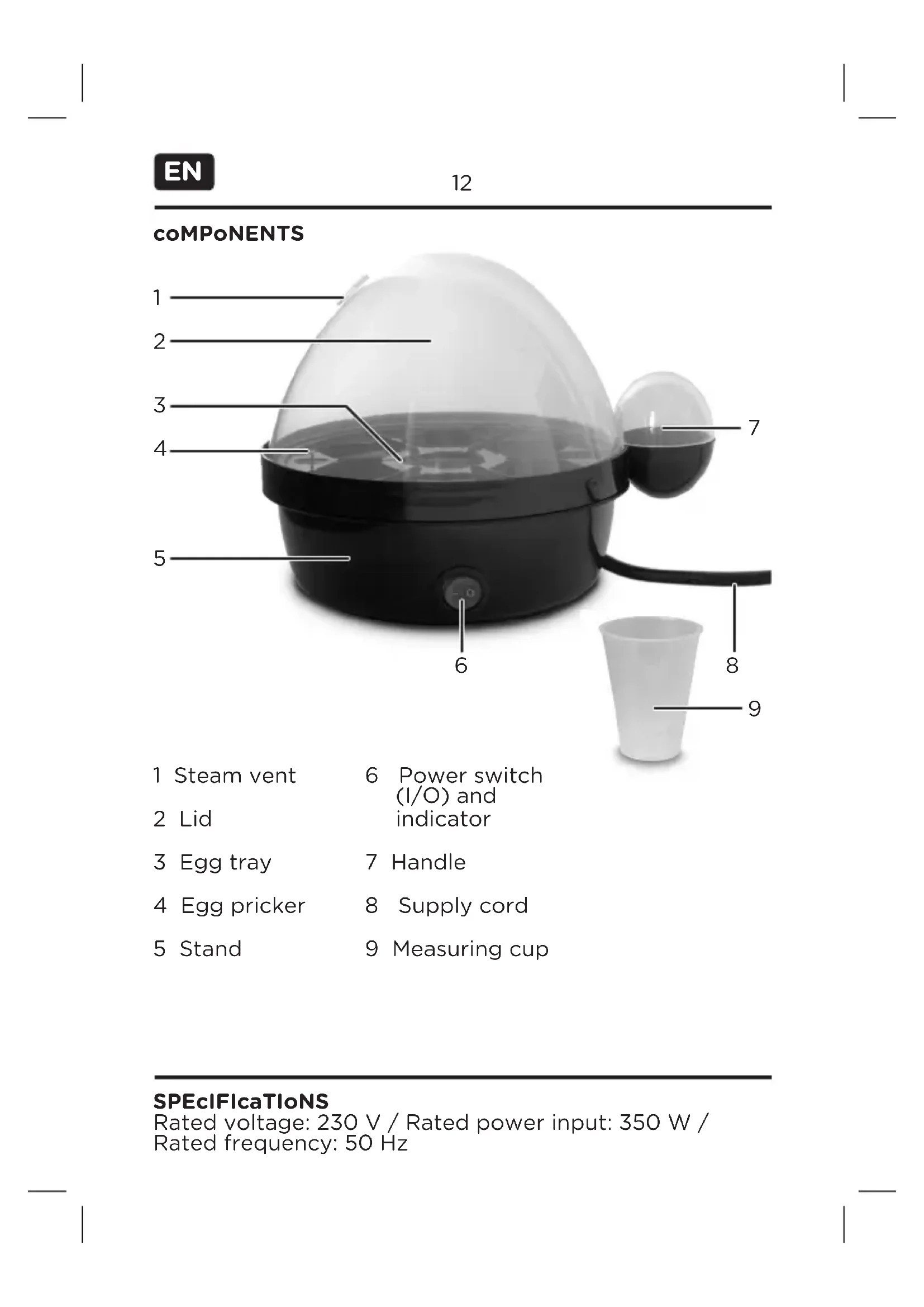 Rated voltage: 230 V / Rated power input: 350 W / Rated frequency: 50 Hz SPEcIFIcaTIoNS 6 Power switch (I/O) and indicator 7 Handle 8 Supply cord 9 Measuring cup12