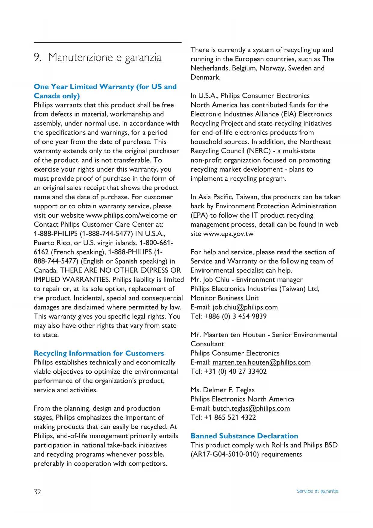 Foire aux questions FRANÇAIS9. Manutenzione e garanzia One Year Limited Warranty (for US and Canada only) Philips warrants that this product shall be free from defects in material, workmanship and assembly, under normal use, in accordance with the specifications and warnings, for a period of one year from the date of purchase. This warranty extends only to the original purchaser of the product, and is not transferable. To exercise your rights under this warranty, you must provide proof of purchase in the form of an original sales receipt that shows the product name and the date of purchase. For customer support or to obtain warranty service, please visit our website www.philips.com/welcome or Contact Philips Customer Care Center at: 1-888-PHILIPS (1-888-744-5477) IN U.S.A., Puerto Rico, or U.S. virgin islands. 1-800-661- 6162 (French speaking), 1-888-PHILIPS (1- 888-744-5477) (English or Spanish speaking) in Canada. THERE ARE NO OTHER EXPRESS OR IMPLIED WARRANTIES. Philips liability is limited to repair or, at its sole option, replacement of the product. Incidental, special and consequential damages are disclaimed where permitted by law. This warranty gives you specific legal rights. You may also have other rights that vary from state to state. Recycling Information for Customers Philips establishes technically and economically viable objectives to optimize the environmental performance of the organization’s product, service and activities. From the planning, design and production stages, Philips emphasizes the important of making products that can easily be recycled. At Philips, end-of-life management primarily entails participation in national take-back initiatives and recycling programs whenever possible, preferably in cooperation with competitors. There is currently a system of recycling up and running in the European countries, such as The Netherlands, Belgium, Norway, Sweden and Denmark. In U.S.A., Philips Consumer Electronics North America has contributed funds for the Electronic Industries Alliance (EIA) Electronics Recycling Project and state recycling initiatives for end-of-life electronics products from household sources. In addition, the Northeast Recycling Council (NERC) - a multi-state non-profit organization focused on promoting recycling market development - plans to implement a recycling program. In Asia Pacific, Taiwan, the products can be taken back by Environment Protection Administration (EPA) to follow the IT product recycling management process, detail can be found in web site www.epa.gov.tw For help and service, please read the section of Service and Warranty or the following team of Environmental specialist can help. Mr. Job Chiu - Environment manager Philips Electronics Industries (Taiwan) Ltd, Monitor Business Unit E-mail: job.chiu@philips.com Tel: +886 (0) 3 454 9839 Mr. Maarten ten Houten - Senior Environmental Consultant Philips Consumer Electronics E-mail: marten.ten.houten@philips.com Tel: +31 (0) 40 27 33402 Ms. Delmer F. Teglas Philips Electronics North America E-mail: butch.teglas@philips.com Tel: +1 865 521 4322 Banned Substance Declaration This product comply with RoHs and Philips BSD (AR17-G04-5010-010) requirements