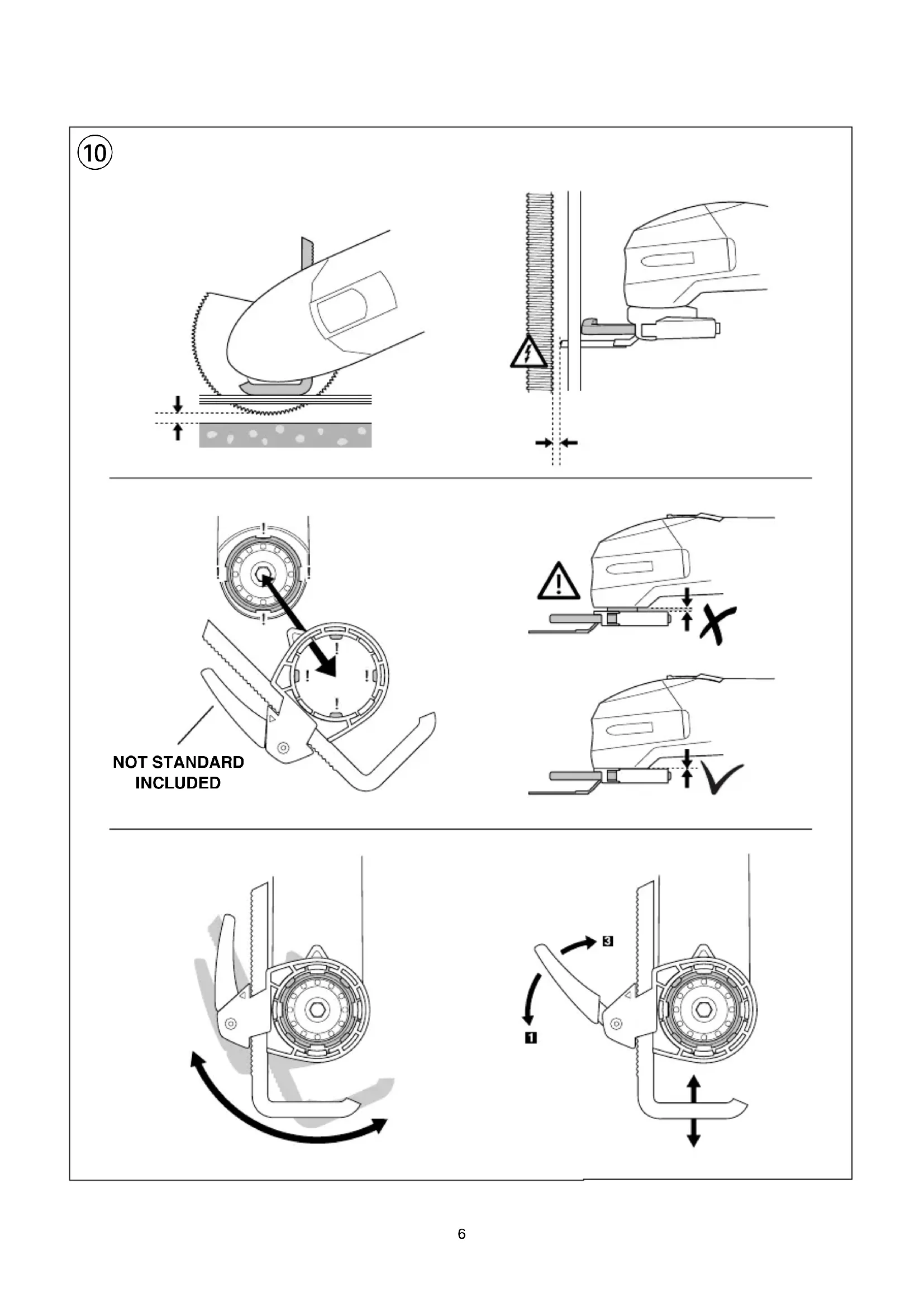 - Changing accessories 5 ! disconnect the plug - remove/mount the required accessory as illustrated - ensure that the openings of the accessory engange into the tabs of the tool head (any snap-in position possible) - mount the accessory with the depressed centre pointing downwards - loosen/fasten screw A with hex key B9 - check the tight seating of the accessory (incorrect or not securely fastened accessories can come loose during operation and create a hazard)