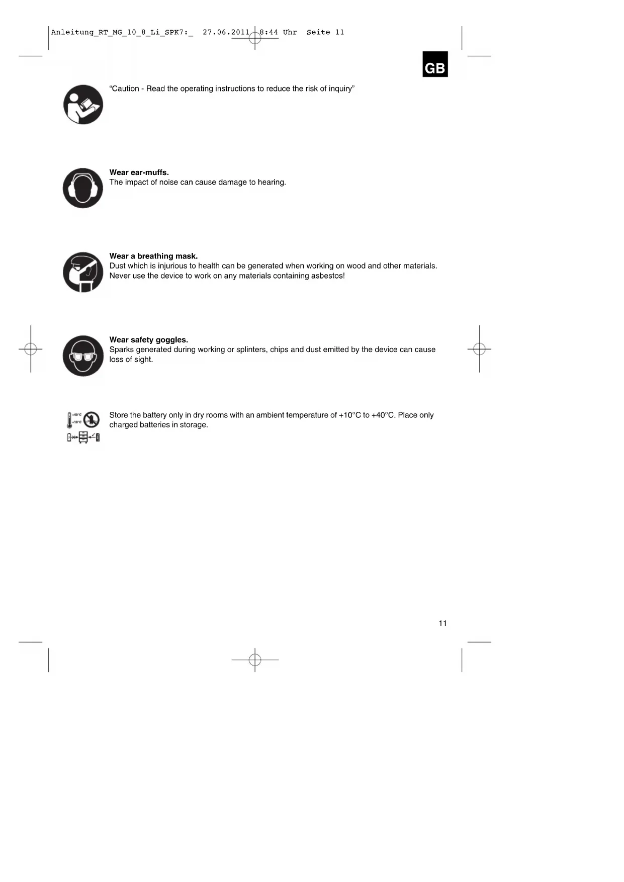 “Caution - Read the operating instructions to reduce the risk of inquiry” Wear ear-muffs. The impact of noise can cause damage to hearing. Wear a breathing mask. Dust which is injurious to health can be generated when working on wood and other materials. Never use the device to work on any materials containing asbestos! Wear safety goggles. Sparks generated during working or splinters, chips and dust emitted by the device can cause loss of sight. Store the battery only in dry rooms with an ambient temperature of +10°C to +40°C. Place only charged batteries in storage. Anleitung_RT_MG_10_8_Li_SPK7:_ 27.06.2011 8:44 Uhr Seite 11 Important! When using the equipment, a few safety precautions must be observed to avoid injuries and damage. Please read the complete operating instructions and safety information with due care. Keep these operating instructions in a safe place so that the information is available at all times. If you give the equipment to any other person, hand over these operating instructions and the safety information as well. We cannot accept any liability for damage or accidents which arise due to a failure to follow these instructions and the safety information.