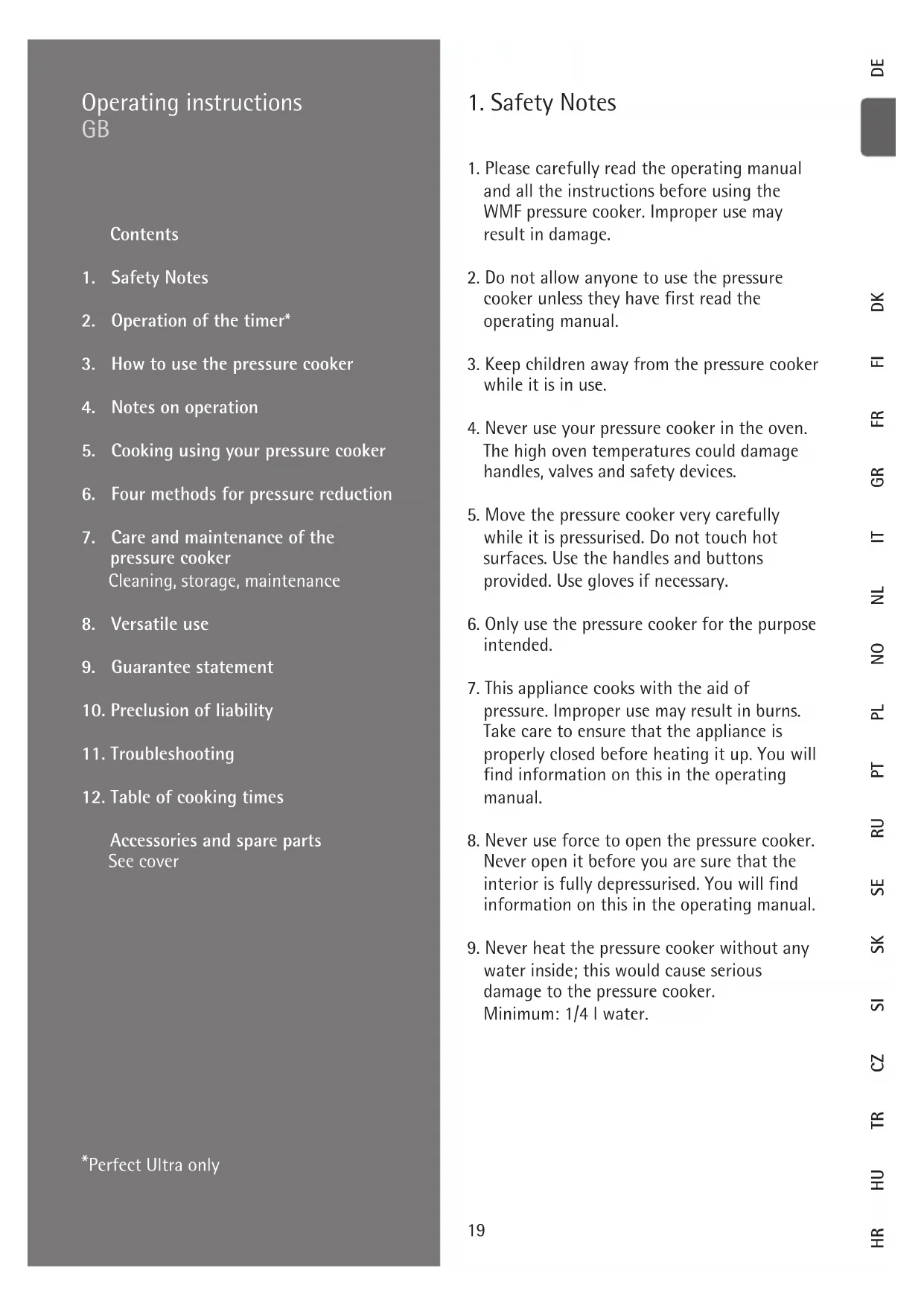 HR24 signal rises to second cooking ring. Excessive pressure is auto matically regulated via the main valve (see Section 5.4 Cooking Times). Switch on timer (12) on the lid handle (5) and enter* the required cooking time. Heat pressure cooker to the highest energy setting. During this heating phase air escapes via the sa- fety valve (4), until the valve closes audibly and pressure can build up. The red indicator (24) on the timer (12) signals that you can* now no longer open the pot (W). The cooking indicator (1) begins to rise. You can observe this through the recess next to the coo- king indicator (I) and regulate in good time the actual energy supply. When the preset heat setting has been reached the timer (12) sounds 3 short bleeps. From now on the preset heat setting will start to count backwards (V)*. 5.4. Cooking times The timer (12) signals that cooking time* has commenced. Take care to ensure that the ring position on the cooking indicator (1) remains stable. Regulate the heat accordingly. If the cooking indicator (1) falls below the re- quired orange ring, you will have to turn up the heat again slightly. This will slightly prolong the cooking time. If the cooking indicator (1) rises above the pre- set heat setting (30c)/(30d), excess steam pres- sure will result. This will escape audibly via the main valve (3) on the lid handle (5). Remove the pot from the hob, wait until the cooking indica- tor (1) has fallen to the corresponding ring, and then replace on the hob with a reduced heat setting. Pressure cooking facilitates shorter cooking times because the steam pressure in the pot re- sults in higher temperatures. First ring, approximately 110 °C (operating pressure 45 kPa, regulating pressure 90 kPa) for delicate foods such as fish or compote Second ring, approximately 119 °C (operating pressure 95 kPa , regulating pressure 130 kPa, max. 150 kPa) for all other foods Energy-conscious users will want to turn off the heat even before the end of the cooking time, since the heat stored in the pot will suf- fice to finish the cooking process. Cooking times may differ for same foodstuffs depending on quantity, form, and composition. 5.5. Information on induction hobs The TransTherm® universal base (11) is suitable for all hob types, including induction hobs. When cooking on induction hobs a humming noise may develop if on a high heat setting. This noise has technical causes and does not indicate that either your hob or your pressure cooker is defective. The pot size must corres- pond to the size of the cooking zone. Other- wise – especially in the case of small diameters – the cooking zone (magnetic zone) may not respond to the pot base. 5.6. Opening the pot The timer (12) signals the end of the cooking time by sounding 5 short bleeps which – if you do not switch it off – is repeated up to four times. You can switch off the sound by briefly pressing the plus or minus keys (25)/(26)*. You have four ways to depressurize the pot (see next page). In principle, the lid should only be opened and removed from the pot once the pot is depressu- rised. This can be recognized by the display (24) on the timer (12) changing from red to green (flashing) (W)*. Also this means that the cooking indicator (1) must have fully disappeared into the handle (5) (J). If the red indication (24) lights up in the timer (12)*, although the cooking indicator (1) has fully disappeared in the pot, the so-called residual pressure safety device is effective. *Perfect Ultra only25 Release the same by pushing forward again the rotary knob (8) and then pulling the same back- ward again (A). Always shake briefly before opening the pot. This will release any pockets of steam from the food. These may form especially when cooking liquid or viscous foods which can spit when re- moving the lid. Now turn the lid handle (5) to the right as described previously, and lift off the lid in an upward direction.