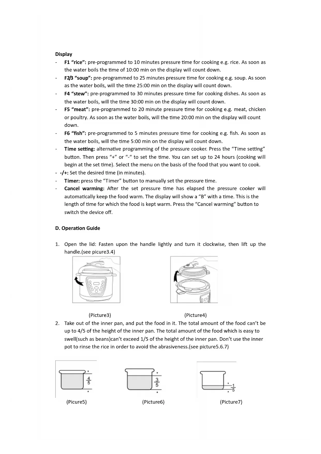 temperature, it will cut off the power automatically and can’t restore any more.C. Components NameDisplay - F1 “rice”: pre-programmed to 10 minutes pressure time for cooking e.g. rice. As soon as the water boils the time of 10:00 min on the display will count down. - F2/3 “soup”: pre-programmed to 25 minutes pressure time for cooking e.g. soup. As soon as the water boils, will the time 25:00 min on the display will count down. - F4 “stew”: pre-programmed to 30 minutes pressure time for cooking dishes. As soon as the water boils, will the time 30:00 min on the display will count down. - F5 “meat”: pre-programmed to 20 minute pressure time for cooking e.g. meat, chicken or poultry. As soon as the water boils, will the time 20:00 min on the display will count down. - F6 “fish”: pre-programmed to 5 minutes pressure time for cooking e.g. fish. As soon as the water boils, will the time 5:00 min on the display will count down. - Time setting: alternative programming of the pressure cooker. Press the “Time setting” button. Then press “+” or “-“ to set the time. You can set up to 24 hours (cooking will begin at the set time). Select the menu on the basis of the food that you want to cook. - -/+: Set the desired time (in minutes). - Timer: press the “Timer” button to manually set the pressure time. - Cancel warming: After the set pressure time has elapsed the pressure cooker will automatically keep the food warm. The display will show a “B” with a time. This is the length of time for which the food is kept warm. Press the “Cancel warming” button to switch the device off. D. Operation Guide