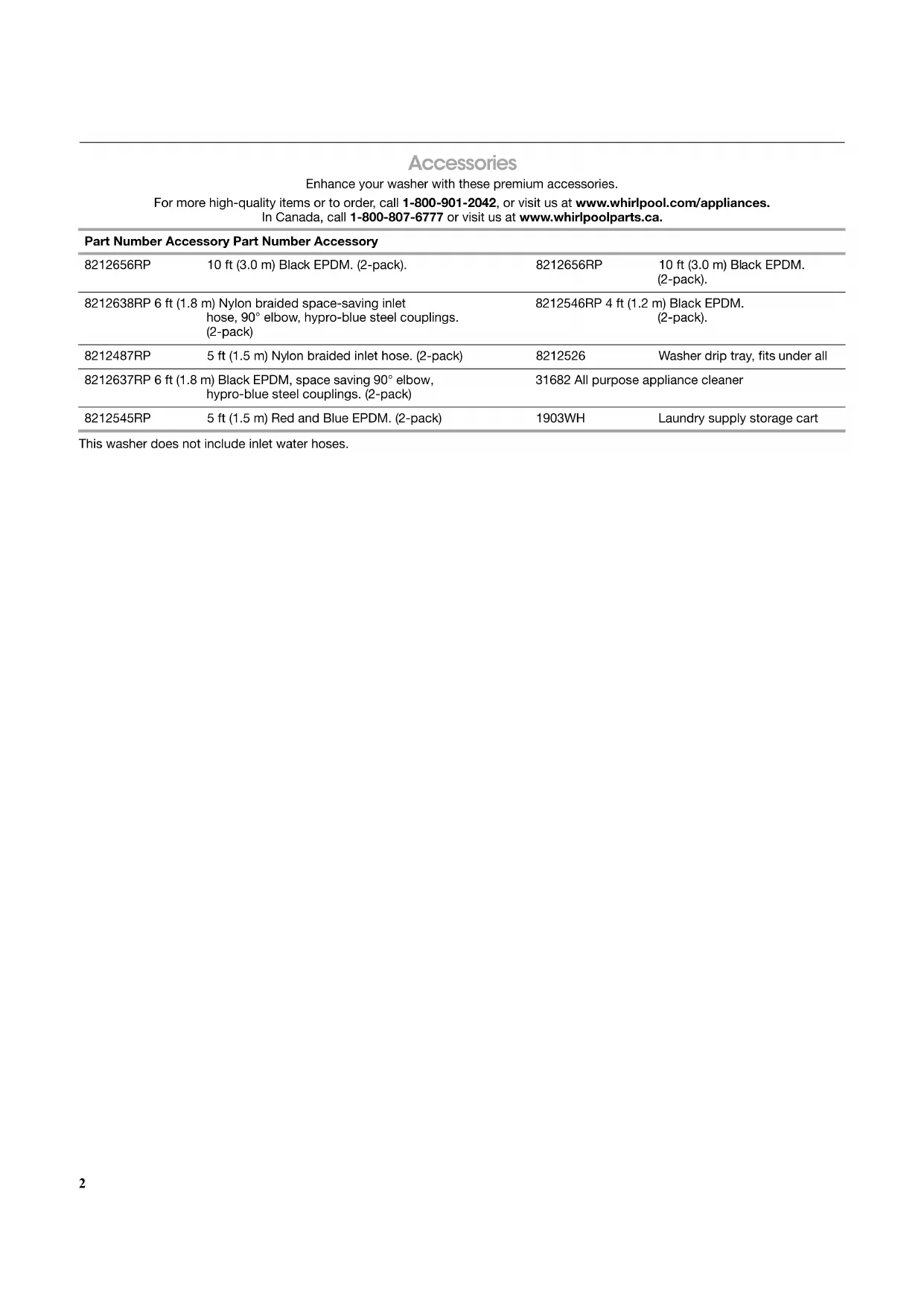 | 8212487RP | 5 ft (1.5 m) Nylon braided inlet hose. (2-pack) | 8212526 | Washer drip tray, fits under all |