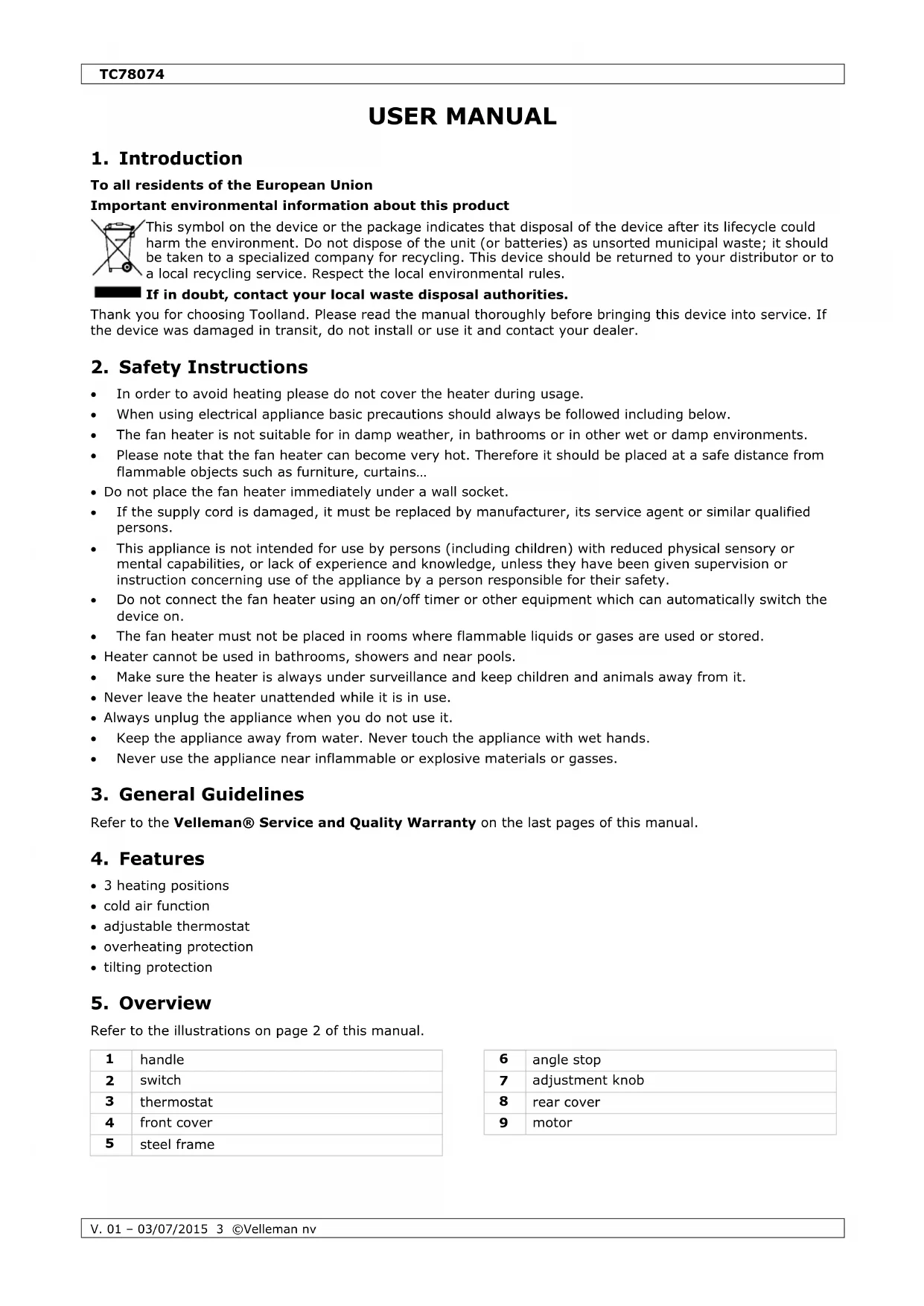 Download the instructions for your Heating in PDF format for free! Find your manual TC78074 - Toolland and take your electronic device back in hand. On this page are published all the documents necessary for the use of your device. TC78074 by Toolland.