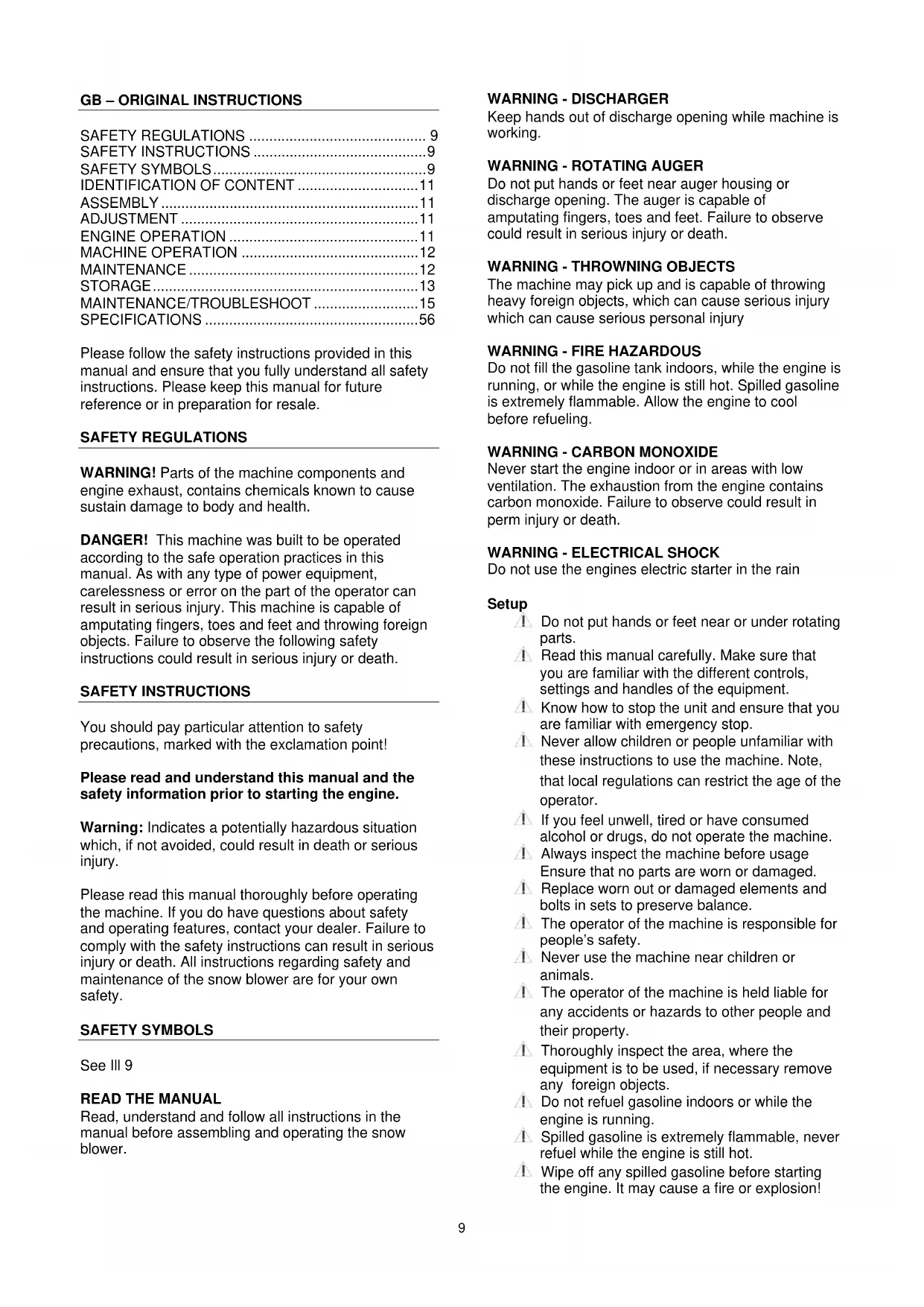 Please read this manual thoroughly before operating the machine. If you do have questions about safety and operating features, contact your dealer. Failure to comply with the safety instructions can result in serious injury or death. All instructions regarding safety and maintenance of the snow blower are for your own safety.