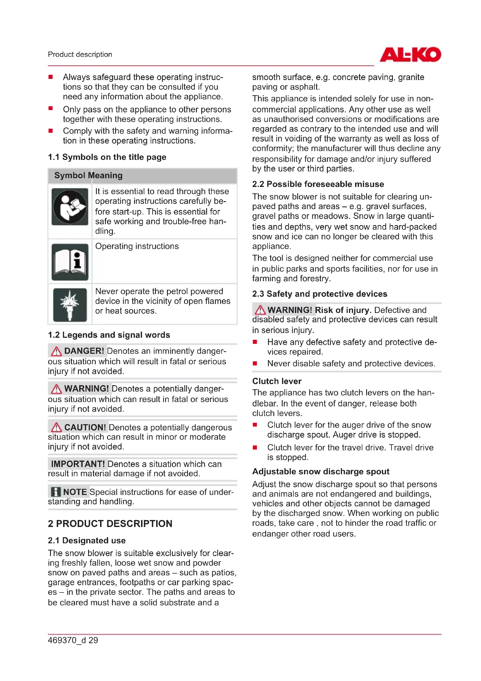 Safety instructions No. Component 10 Snow discharge spout with guard 11 Lights 12 Hand crank for adjusting the discharge direction 13 Tank cap 14 Oil filler cap 15 Plough 16 Cleaning tool (attached to the plough) 17 Spark plug connector 18 Transport auger 19 Discharge wheel 20 Clearing plate 21 Height-adjustable skids 3 SAFETY INSTRUCTIONS DANGER! Danger of fatal injury and dan- ger of extremely severe injury! Lack of knowl- edge of the safety instructions and operating in- structions can lead to extremely serious and even fatal injury.