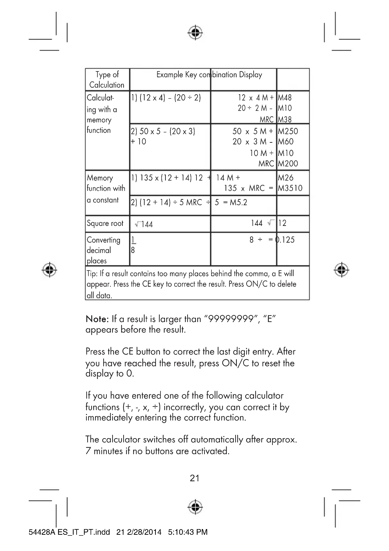 - Swallowing a coin cell can lead to choking. Consult a doctor immediately. 54428A ES_IT_PT.indd 19 2/28/2014 5:10:43 PM20 CALCULATOR FUNCTIONS Type of Calculation Example Key combination Display Addition and Subtraction 123 + 456 – 789 123 + 456 – 789 = –210 Multiplica- tion