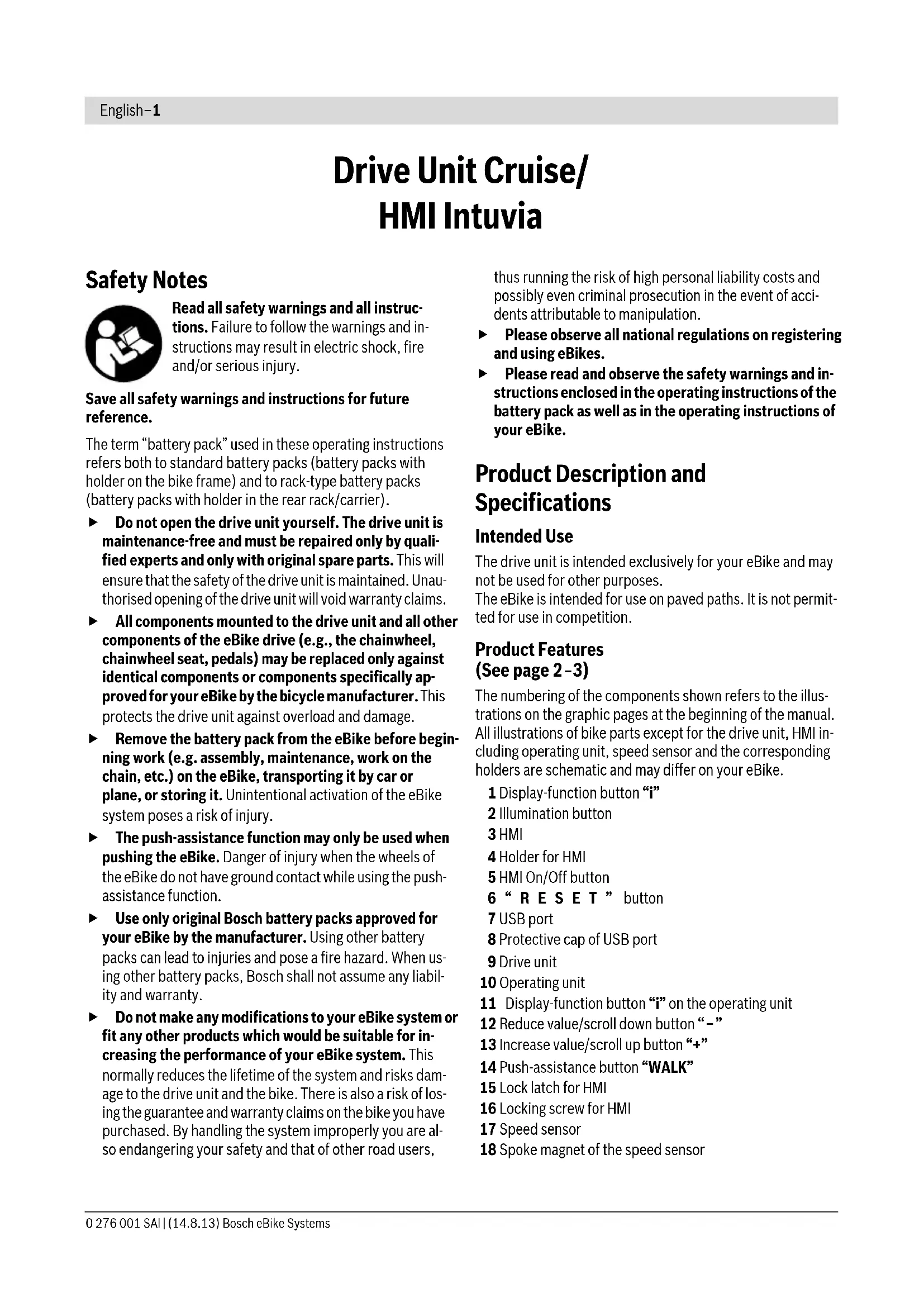 Please read and observe the safety warnings and instructions enclosed in the operating instructions of the battery pack and drive unit/HMI, as well as in the operating instructions of your eBike.