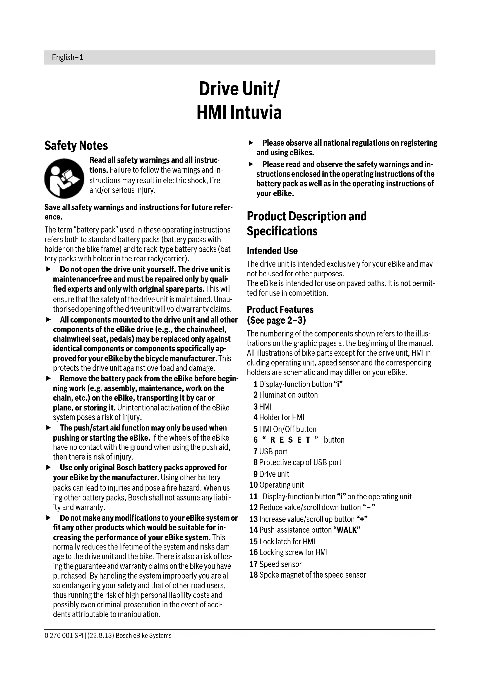 Please read and observe the safety warnings and instructions enclosed in the operating instructions of the battery pack and drive unit/HMI, as well as in the operating instructions of your eBike.