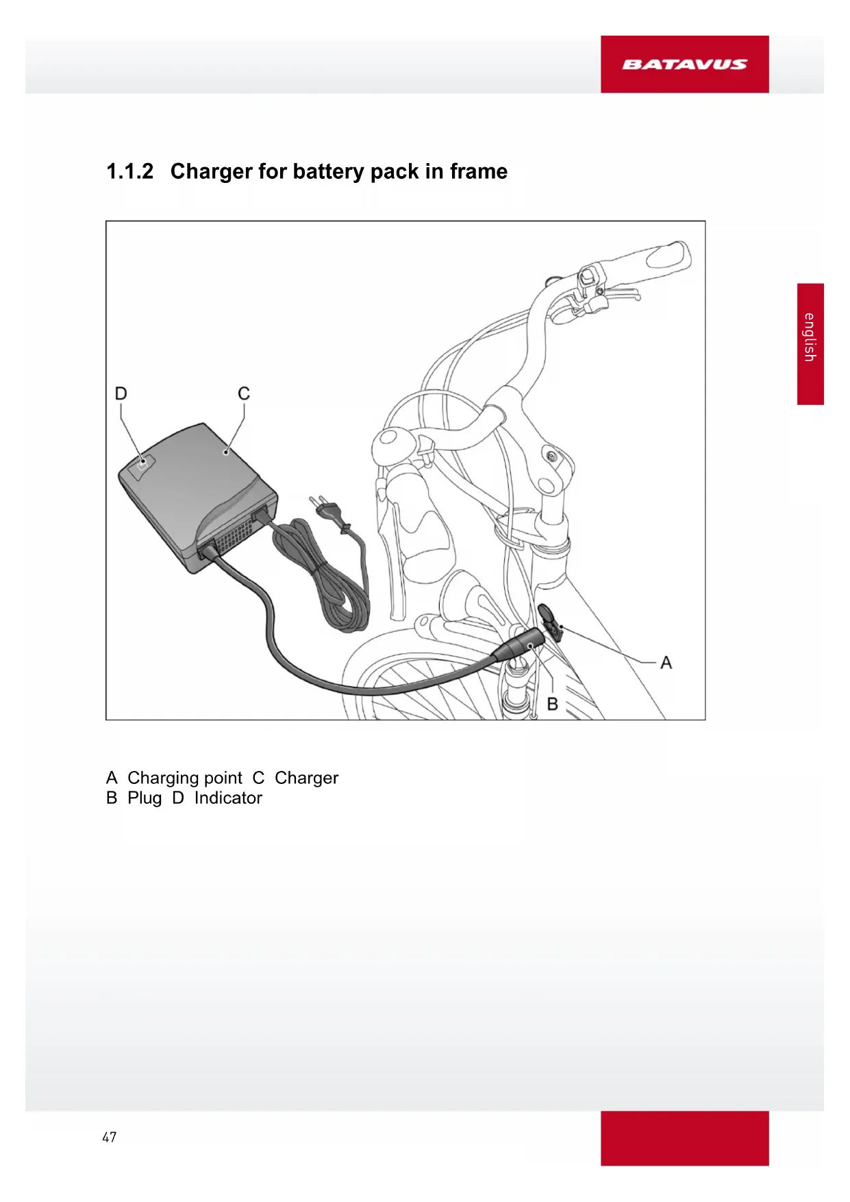 - Connect the plug (C) of the charger to the contact point (D).