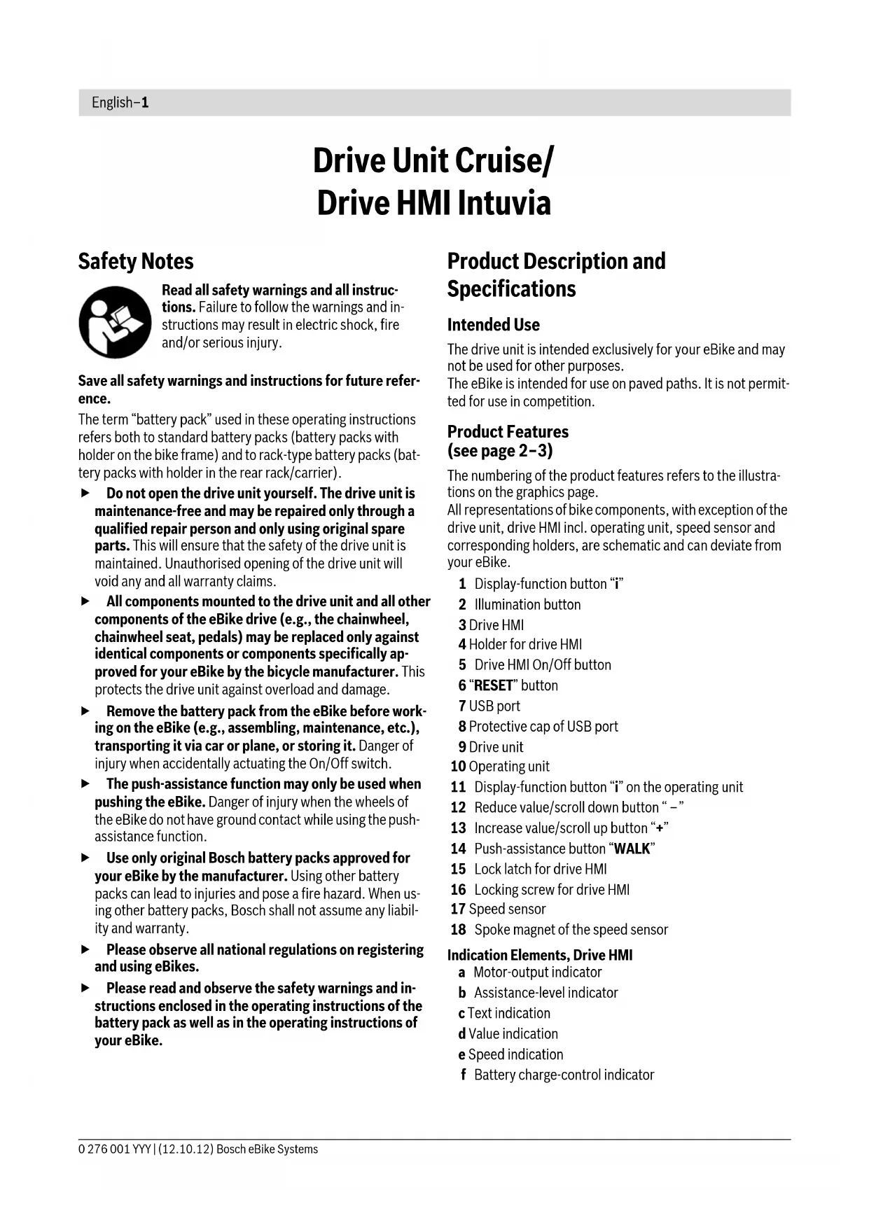 ▶ Please read and observe the safety warnings and instructions enclosed in the operating instructions of the battery pack and drive unit/drive HMI, as well as in the operating instructions of your eBike.