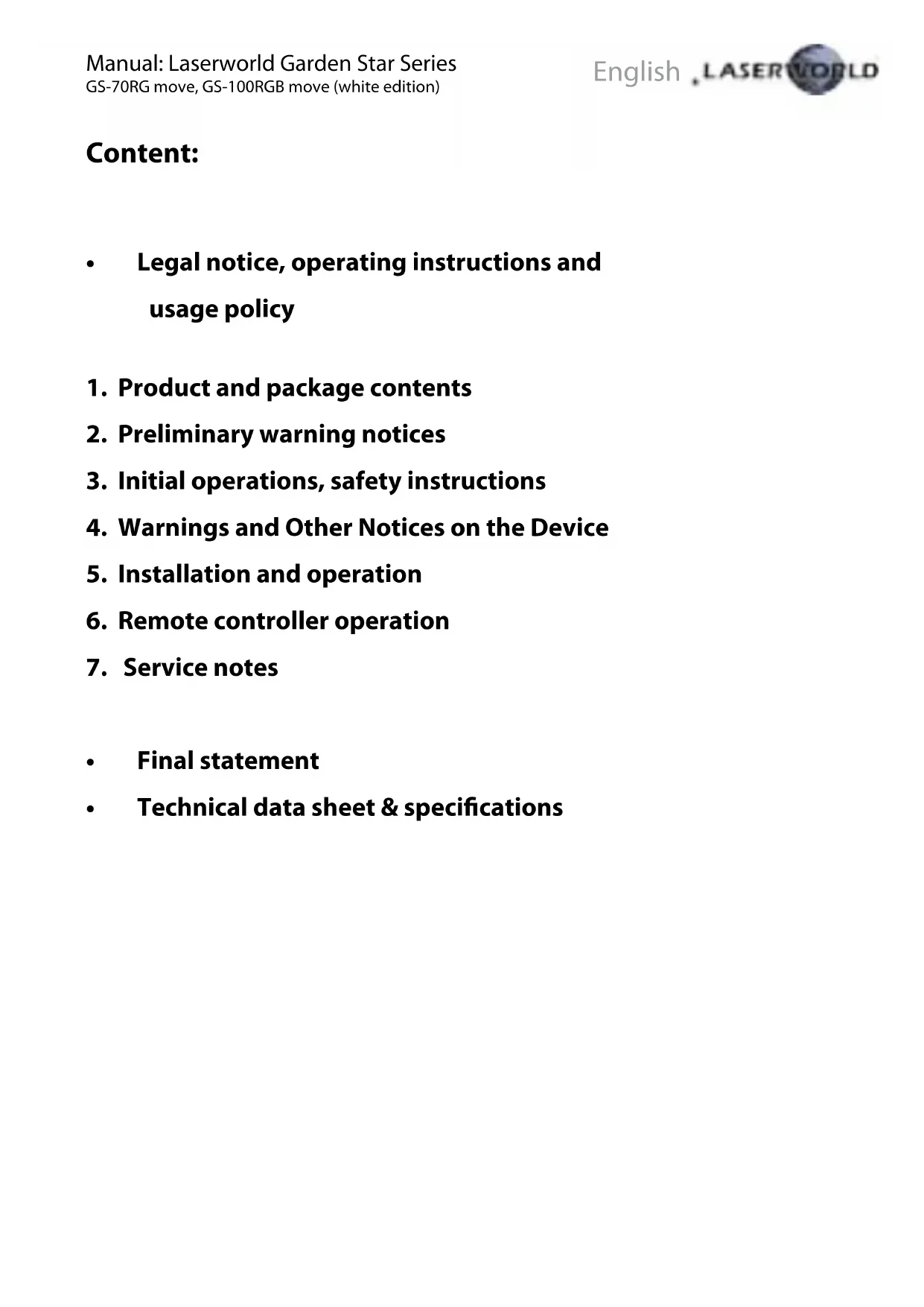 Operating instructions and usage policy: The laser systems of the Laserworld Garden Star Series are intended for private use only. This device is no toy and must not be operated by minors or children!