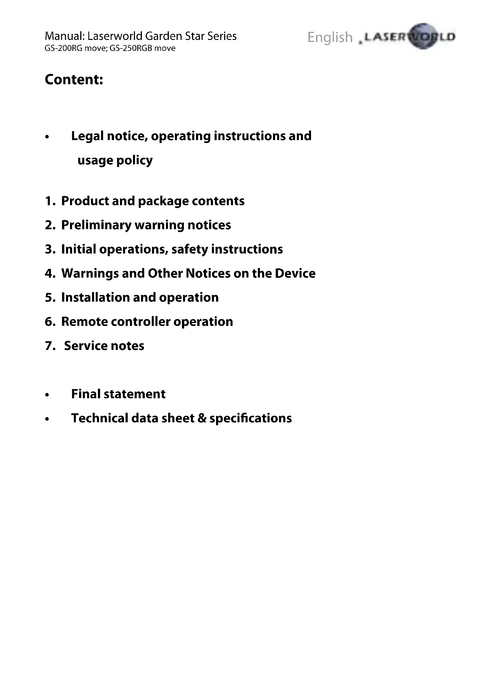 Due to continual product developments, please check for the latest update of this product manual at www.laserworld.com. If you do have any further questions, then please contact your dealer/place of purchase or use our contact section on our website.