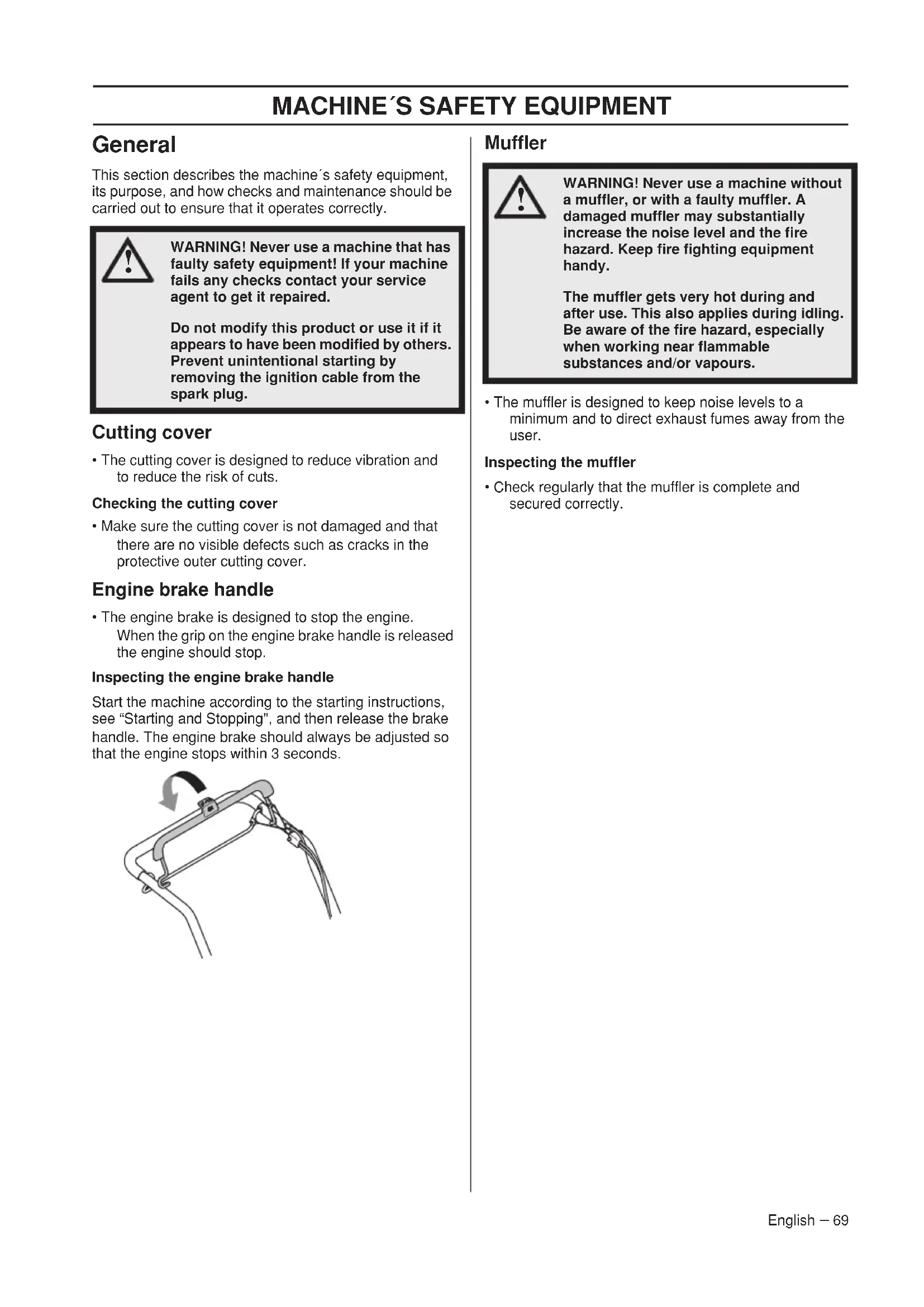 - The engine brake is designed to stop the engine. When the grip on the engine brake handle is released the engine should stop.Inspecting the engine brake handleStart the machine according to the starting instructions, see “Starting and Stopping", and then release the brake handle. The engine brake should always be adjusted so that the engine stops within 3 seconds. Muffler