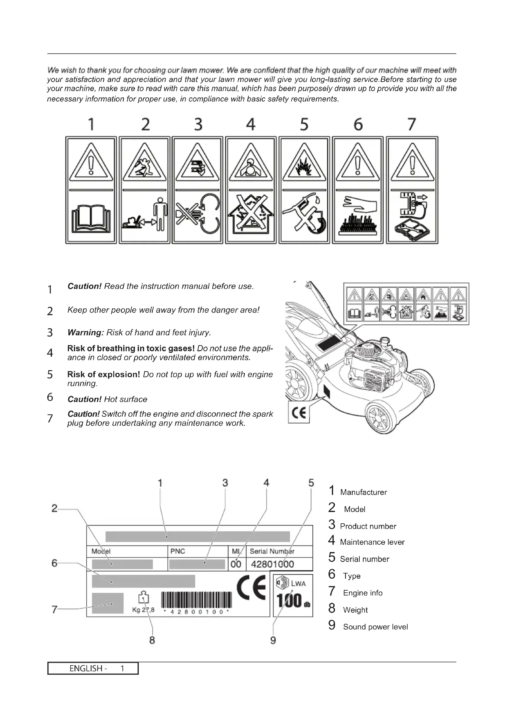 Risk of breathing in toxic gases! Do not use the appli- ance in closed or poorly ventilated environments. Risk of explosion! Do not top up with fuel with engine running. Caution! Hot surface Caution! Switch off the engine and disconnect the spark plug before undertaking any maintenance work. your satisfaction and appreciation and that your lawn mower will give you long-lasting service.Before starting to use your machine, make sure to read with care this manual, which has been purposely drawn up to provide you with all the necessary information for proper use, in compliance with basic safety requirements.