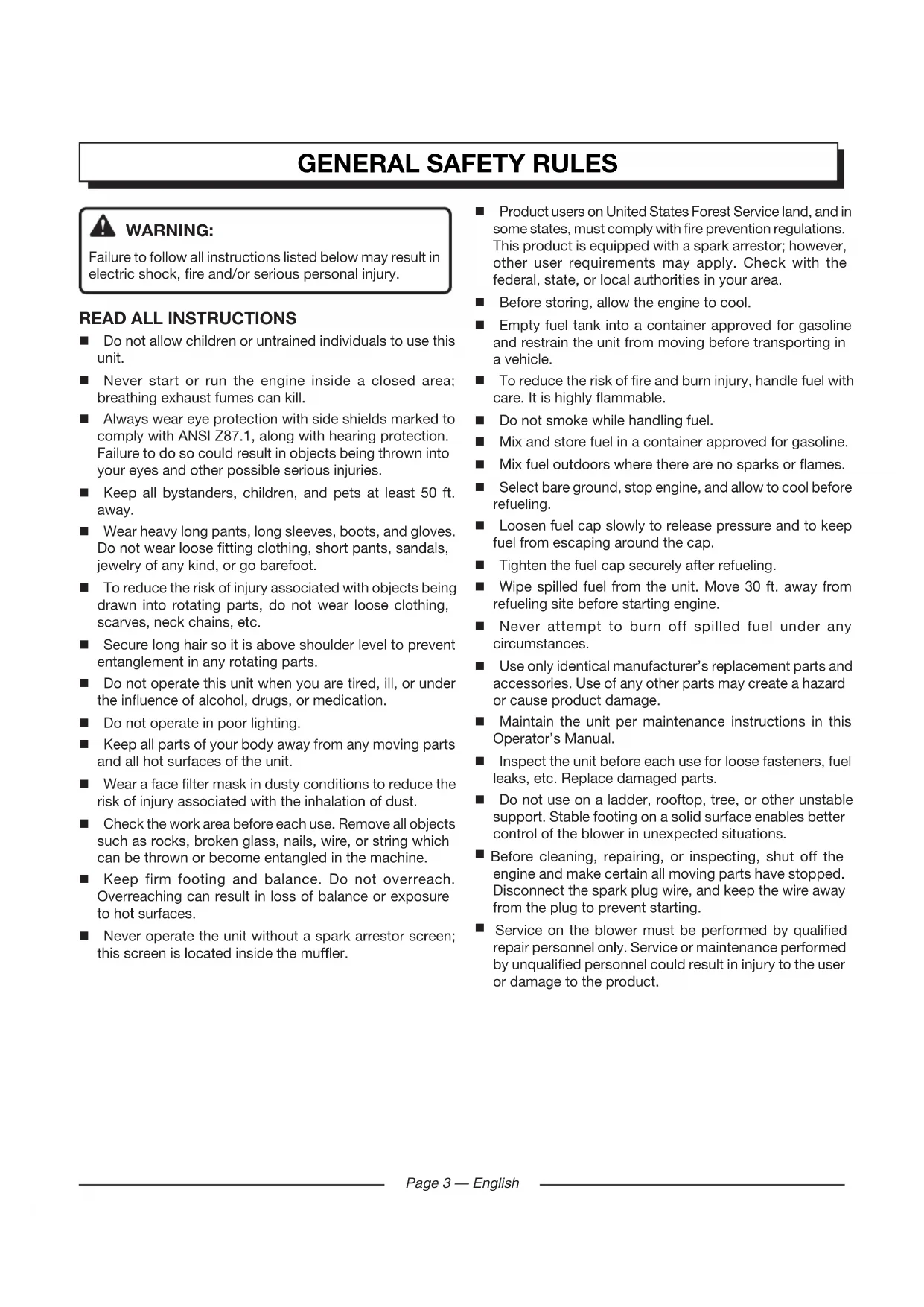 Do not allow children or untrained individuals to use this unit. Never start or run the engine inside a closed area; breathing exhaust fumes can kill. Always wear eye protection with side shields marked to comply with ANSI Z87.1, along with hearing protection. Failure to do so could result in objects being thrown into your eyes and other possible serious injuries. Keep all bystanders, children, and pets at least 50 ft. away. Wear heavy long pants, long sleeves, boots, and gloves. Do not wear loose fitting clothing, short pants, sandals, jewelry of any kind, or go barefoot. To reduce the risk of injury associated with objects being drawn into rotating parts, do not wear loose clothing, scarves, neck chains, etc. Secure long hair so it is above shoulder level to prevent entanglement in any rotating parts. Do not operate this unit when you are tired, ill, or under the influence of alcohol, drugs, or medication. Do not operate in poor lighting. Keep all parts of your body away from any moving parts and all hot surfaces of the unit. Wear a face filter mask in dusty conditions to reduce the risk of injury associated with the inhalation of dust. Check the work area before each use. Remove all objects such as rocks, broken glass, nails, wire, or string which can be thrown or become entangled in the machine. Keep firm footing and balance. Do not overreach. Overreaching can result in loss of balance or exposure to hot surfaces. Never operate the unit without a spark arrestor screen; this screen is located inside the muffler. Product users on United States Forest Service land, and in some states, must comply with fire prevention regulations. This product is equipped with a spark arrestor; however, other user requirements may apply. Check with the federal, state, or local authorities in your area. Before storing, allow the engine to cool. Empty fuel tank into a container approved for gasoline and restrain the unit from moving before transporting in a vehicle. To reduce the risk of fire and burn injury, handle fuel with care. It is highly flammable. Do not smoke while handling fuel. Mix and store fuel in a container approved for gasoline. Mix fuel outdoors where there are no sparks or flames. Select bare ground, stop engine, and allow to cool before refueling. Loosen fuel cap slowly to release pressure and to keep fuel from escaping around the cap. Tighten the fuel cap securely after refueling. Wipe spilled fuel from the unit. Move 30 ft. away from refueling site before starting engine. Never attempt to burn off spilled fuel under any circumstances. Use only identical manufacturer’s replacement parts and accessories. Use of any other parts may create a hazard or cause product damage. Maintain the unit per maintenance instructions in this Operator’s Manual. Inspect the unit before each use for loose fasteners, fuel leaks, etc. Replace damaged parts. Do not use on a ladder, rooftop, tree, or other unstable support. Stable footing on a solid surface enables better control of the blower in unexpected situations.
