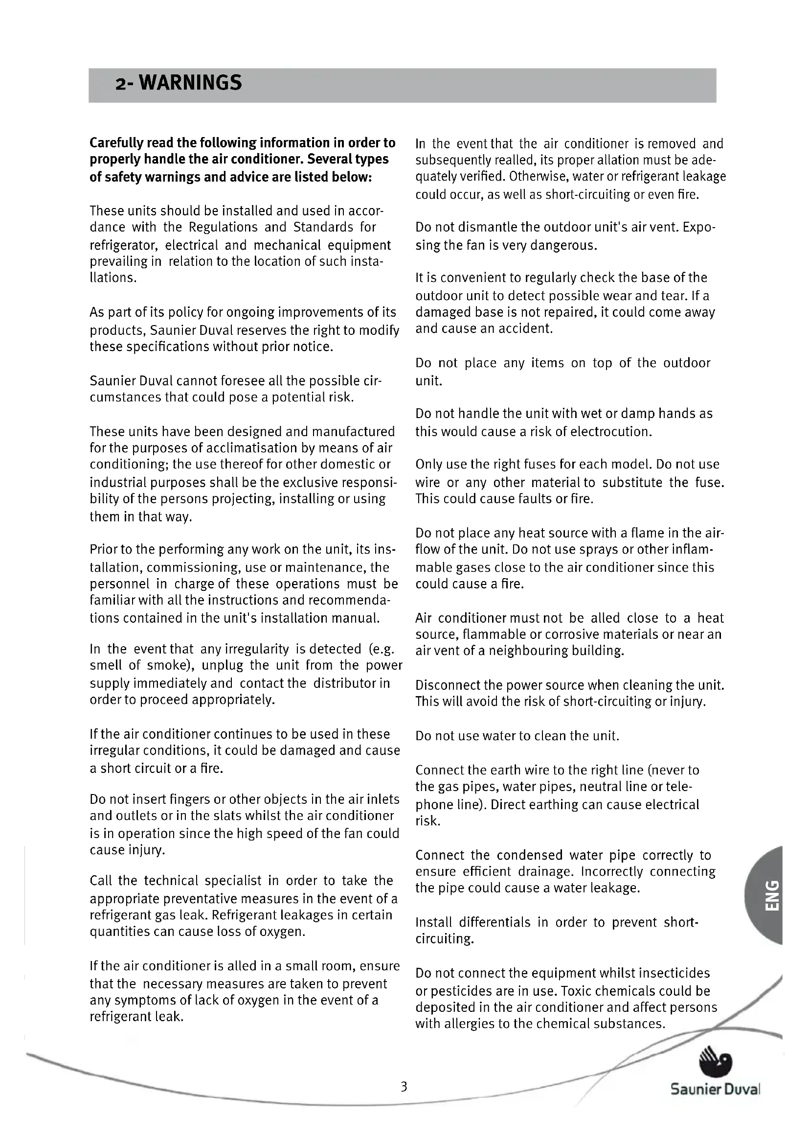 Carefully read the following information in order to properly handle the air conditioner. Several types of safety warnings and advice are listed below: These units should be installed and used in accor- dance with the Regulations and Standards for refrigerator, electrical and mechanical equipment prevailing in relation to the location of such insta- llations. As part of its policy for ongoing improvements of its products, Saunier Duval reserves the right to modify these specifications without prior notice. Saunier Duval cannot foresee all the possible cir- cumstances that could pose a potential risk. These units have been designed and manufactured for the purposes of acclimatisation by means of air conditioning; the use thereof for other domestic or industrial purposes shall be the exclusive responsi- bility of the persons projecting, installing or using them in that way. Prior to the performing any work on the unit, its ins- tallation, commissioning, use or maintenance, the personnel in charge of these operations must be familiar with all the instructions and recommenda- tions contained in the unit's installation manual. In the event that any irregularity is detected (e.g. smell of smoke), unplug the unit from the power supply immediately and contact the distributor in order to proceed appropriately. If the air conditioner continues to be used in these irregular conditions, it could be damaged and cause a short circuit or a fire. Do not insert fingers or other objects in the air inlets and outlets or in the slats whilst the air conditioner is in operation since the high speed of the fan could cause injury. Call the technical specialist in order to take the appropriate preventative measures in the event of a refrigerant gas leak. Refrigerant leakages in certain quantities can cause loss of oxygen. If the air conditioner is alled in a small room, ensure that the necessary measures are taken to prevent any symptoms of lack of oxygen in the event of a refrigerant leak. In the event that the air conditioner is removed and subsequently realled, its proper allation must be ade- quately verified. Otherwise, water or refrigerant leakage could occur, as well as short-circuiting or even fire. Do not dismantle the outdoor unit's air vent. Expo- sing the fan is very dangerous. It is convenient to regularly check the base of the outdoor unit to detect possible wear and tear. If a damaged base is not repaired, it could come away and cause an accident. Do not place any items on top of the outdoor unit. Do not handle the unit with wet or damp hands as this would cause a risk of electrocution. Only use the right fuses for each model. Do not use wire or any other material to substitute the fuse. This could cause faults or fire. Do not place any heat source with a flame in the air- flow of the unit. Do not use sprays or other inflam- mable gases close to the air conditioner since this could cause a fire. Air conditioner must not be alled close to a heat source, flammable or corrosive materials or near an air vent of a neighbouring building. Disconnect the power source when cleaning the unit. This will avoid the risk of short-circuiting or injury. Do not use water to clean the unit. Connect the earth wire to the right line (never to the gas pipes, water pipes, neutral line or tele- phone line). Direct earthing can cause electrical risk. Connect the condensed water pipe correctly to ensure efficient drainage. Incorrectly connecting the pipe could cause a water leakage. Install differentials in order to prevent short- circuiting. Do not connect the equipment whilst insecticides or pesticides are in use. Toxic chemicals could be deposited in the air conditioner and affect persons with allergies to the chemical substances.54 ENG