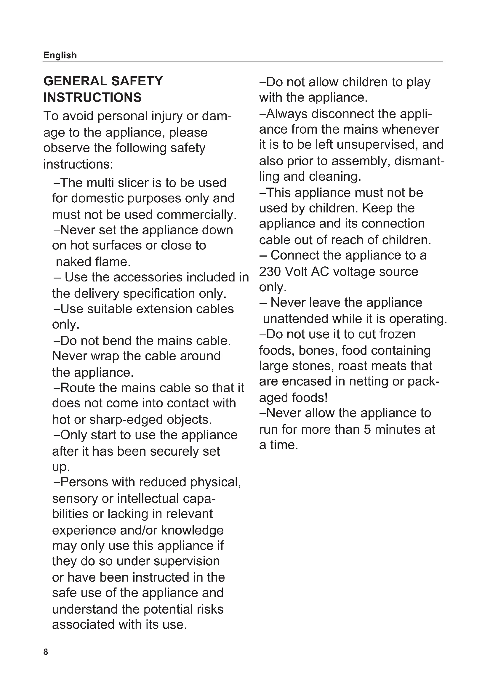 - After each use, turn the slice thickness adjustment knob to the "0" position, in order to cover up the sharp rotating blade and to avoid any injuries. Pull the slice tray (3) to the right and out of the appliance. CLEANING Caution: Switch the appliance off before cleaning it; pull the mains plug out off the socket and turn the slice thickness adjustment knob (2) to the "0" position. Clean the multi slicer regularly to prevent the accumulation of food residue. The rotary blade must also be cleaned regularly as described below to prevent its surface from rusting. Note: Over time, an accumulation of food residue may cause damage to the surface of the rotary blade, causing it to rust. Preparation