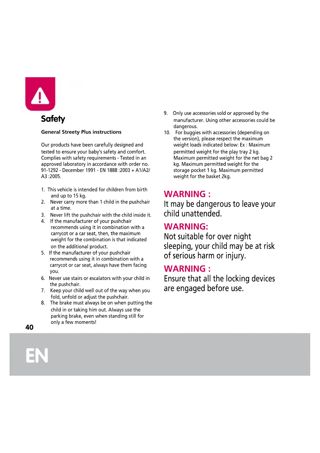 Safety General Streety Plus instructions Our products have been carefully designed and tested to ensure your baby’s safety and comfort. Complies with safety requirements - Tested in an approved laboratory in accordance with order no. 91-1292 - December 1991 - EN 1888 :2003 + A1/A2/ A3 :2005.