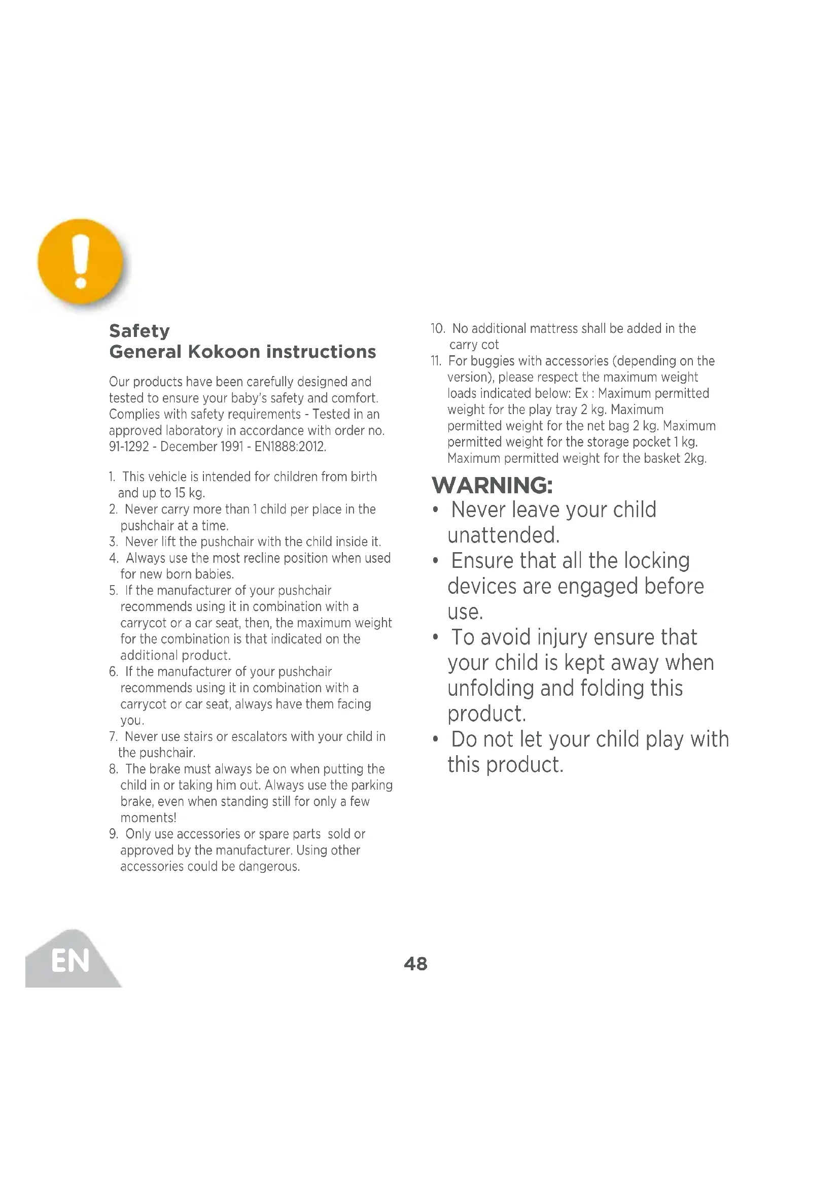 Safety General Kokoon instructions Our products have been carefully designed and tested to ensure your baby’s safety and comfort. Complies with safety requirements - Tested in an approved laboratory in accordance with order no. 91-1292 - December 1991 - EN1888:2012.